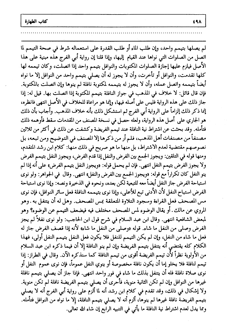 لم يصلها بتيمم واحد وإن طلب الماء أو طلب القدرة على استعماله شرط في صحة التيمم لما اتصل من الصلوات التي نواها عند القيام إليها وإذا قلنا إن رواية أبي الفرج هذه مبنية على هذا الأصل فيلزم عليها إجازة الصلوات المكتوبات والنوافل بتيمم واحد إذا اتصلت وكان تيممه لها كلها تقدمت والنوافل أو تأخرت وأن لا يجوز له أن يصلي بتيمم واحد من النوافل إلا ما نواه أيضا بتيممه واتصل عمله وأن لا يجوز له بتيممه لمكتوبة نافلة لم ينوها وإن اتصلت بالمكتوبة فإن قال قائل لا خلاف في المذهب في جواز النافلة بتيمم المكتوبة إذا اتصلت بها قيل له إذا جاز ذلك على هذه الرواية فليس على أصله فيها وإنما هو مراعاة للخلاف في الأصل انتهى. فانظره إنما ذكر ذلك إلزاما على الرواية أبي الفرج ثم استشكل ذلك بأنه خلاف المذهب وأجاب بأن ذلك هو الجاري على أصل هذه الرواية ولعله حصل في نسخة المصنف من المقدمات سقط فأوهمه ذلك فتأمله وقد بحثت عن اشتراط نية النافلة عند تيمم الفريضة وكشفت عن ذلك في أكثر من ثلاثين مصنفا من مصنفات أهل المذهب فلم أر من ذكرها إلا المصنف في التوضيح ومن تبعه بل نصوصهم مقتضية لعدم الاشتراط بل منها ما هو صريح في ذلك منها كلام ابن رشد المتقدم ومنها قوله في التلقين ويجوز الجمع بين الفرض والنفل إذا قدم الفرض ويجوز النفل بتيمم الفرض ولا يجوز الفرض بتيمم النفل انتهى. فإن لم يحمل قوله ويجوز النفل بتيمم الفرض على أنه إذا لم ينو النفل كان تكرارا مع قوله ويجوز الجمع بين الفرض والنفل انتهى. وقال في الجواهر ولو نوى استباحة الفرض جاز النفل أيضا معه للتبعية لكن بعده ونحوه في الذخيرة ونصه وإذا نوى استباحة الفرض استباح النفل لأن الأدنى تبع للأعلى وإذا نوى بتيممه النافلة فعل سائر النوافل فإن نوى مس المصحف فعل القراءة وسجود التلاوة المتعلقة بمس المصحف وهل له أن يتنفل به وهو المروي عن مالك أو يقال الوضوء لمس المصحف مختلف فيه فيضعف التيمم عن الوضوء وهو لمبعض الشافعية انتهى. وقال ابن عبد السلام في شرح قول ابن الحاجب: "ولو نوى نفلا لم يجز الفرض وصلى من النفل ما شاء" قوله: "وصلى من النفل ما شاء" لأنه إذا قصف الفرض جاز له فعل ما شاء من النفل وإن لم يكن التيمم للنفل فلا يكون فعل النفل بتيمم النفل أولى فهذا الكلام كله يقتضي أنه يتنفل بتيمم الفريضة وإن لم ينو النافلة إلا أن فيما ذكره ابن عبد السلام من الأولوية نظرا لأن تيمم الفريضة أقوى من تيمم النافلة كما سنذكره الآن وقال في الطراز إذا تيمم لنافلة فلا يخلو إما أن يكون نافلة مخصوصة أو ينوي النفل عموما فإن نوى عموم النفل أو نوى صلاة نافلة فله أن يتنفل بذلك ما شاء في فور واحد انتهى. فإذا جاز أن يصلي بتيمم نافلة غيرها من النوافل وإن لم تكن الثانية منوية فأحرى أن يصلي بتيمم الفريضة نافلة لم تكن منوية ولا إشكال في ذلك وقد تقدم في كلام ابن رشد أنه لما ألزم على رواية أبي الفرج أنه لا يصلي بتيمم الفريضة نافلة غيرها لم ينوها ألزم أنه لا يصلي بتيمم النافلة إلا ما نواه من النوافل فتأمله ومما يدل لعدم اشتراط نية النافلة ما يأتي في التنبيه الرابع إن شاء الله تعالى.