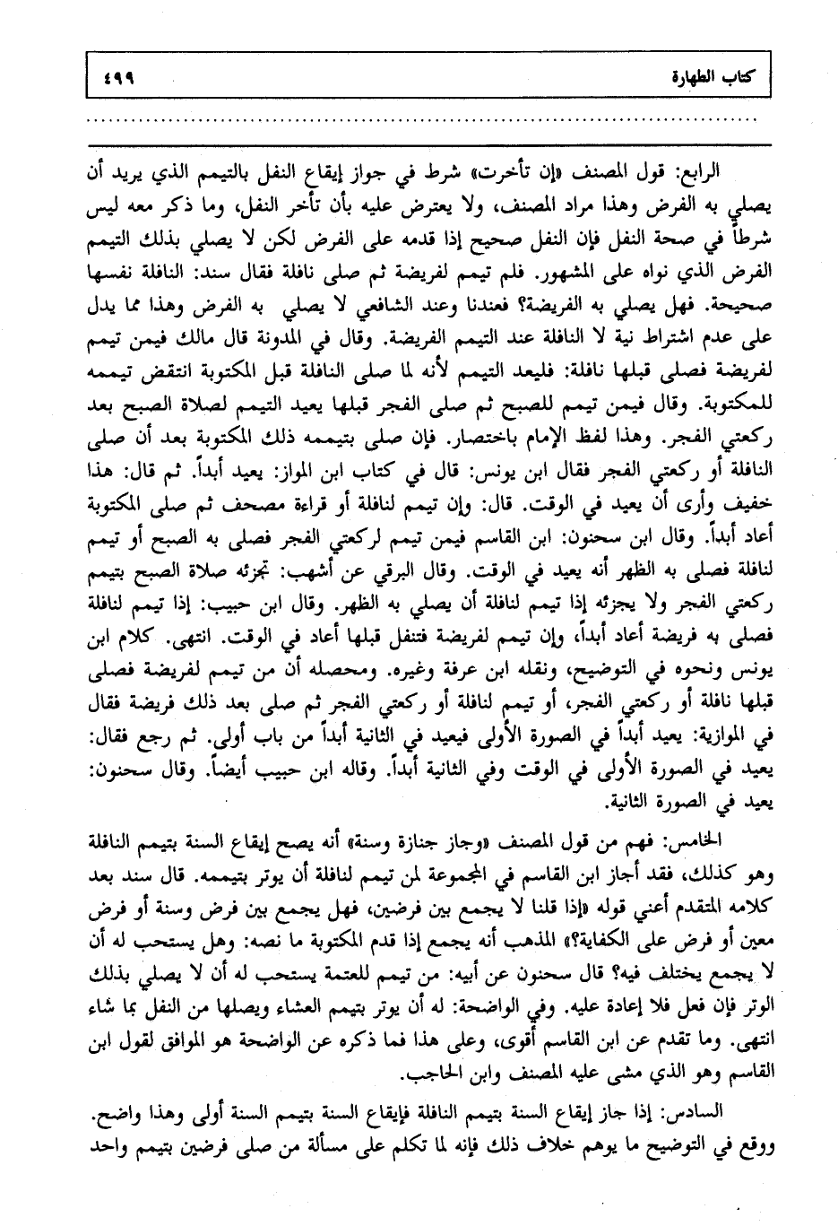 الرابع : قول المصنف إن تأخرت شرط في جواز إيقاع النفل بالتيمم الذي يريد أن يصلي به الفرض وهذا مراد المصنف ولا يعترض عليه بأن تأخر النفل وما ذكر معه ليس شرطا في صحة النفل فإن النفل صحيح إذا قدمه على الفرض لكن لا يصلي بذلك التيمم الفرض الذي نواه على المشهور فلم تيمم لفريضة ثم صلى نافلة فقال سند النافلة نفسها صحيحة فهل يصلي به الفريضة فعندنا وعند الشافعي لا يصلي به الفرض وهذا مما يدل على عدم اشتراط نية لا النافلة عند التيمم الفريضة وقال في المدونة: قال مالك فيمن تيمم لفريضة فصلى قبلها نافلة: فليعد التيمم لأنه لما صلى النافلة قبل المكتوبة انتقض تيممه للمكتوبة وقال فيمن تيمم للصبح ثم صلى الفجر قبلها يعيد التيمم لصلاة الصبح بعد ركعتي الفجر وهذا لفظ الإمام باختصار فإن صلى بتيممه ذلك المكتوبة بعد أن صلى النافلة أو ركعتي الفجر فقال ابن يونس قال في كتاب ابن المواز يعيد أبدا ثم قال هذا خفيف وأرى أن يعيد في الوقت قال وإن تيمم لنافلة أو قراءة مصحف ثم صلى المكتوبة أعاد أبدا وقال ابن سحنون ابن القاسم فيمن تيمم لركعتي الفجر فصلى به الصبح أو تيمم لنافلة فصلى به الظهر أنه يعيد في الوقت وقال البرقي عن أشهب تجزئه صلاة الصبح بتيمم ركعتي الفجر ولا يجزئه إذا تيمم لنافلة أن يصلي به الظهر وقال ابن حبيب: إذا تيمم لنافلة فصلى به فريضة أعاد أبدا وإن تيمم لفريضة فتنفل قبلها أعاد في الوقت انتهى. كلام ابن يونس ونحوه في التوضيح ونقله ابن عرفة وغيره ومحصله أن من تيمم لفريضة فصلى قبلها نافلة أو ركعتي الفجر أو تيمم لنافلة أو ركعتي الفجر ثم صلى بعد ذلك فريضة فقال في الموازية يعيد أبدا في الصورة الأولى فيعيد في الثانية أبدا من باب أولى ثم رجع فقال يعيد في الصورة الأولى في الوقت وفي الثانية أبدا وقاله ابن حبيب أيضا وقال سحنون يعيد في الصورة الثانية.