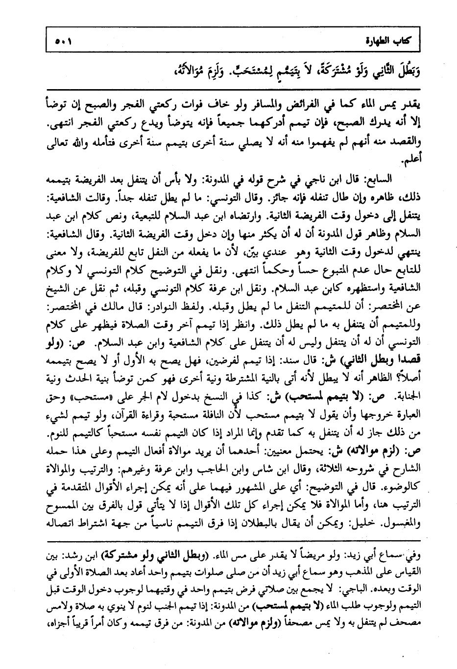 السابع : قال ابن ناجي في شرح قوله في المدونة: ولا بأس أن يتنفل بعد الفريضة بتيممه ذلك ظاهره وإن طال تنفله فإنه جائز وقال التونسي: ما لم يطل تنفله جدا وقالت الشافعية يتنفل إلى دخول وقت الفريضة الثانية وارتضاه ابن عبد السلام للتبعية ونص كلام ابن عبد السلام وظاهر قول المدونة أن له أن يكثر منها وإن دخل وقت الفريضة الثانية وقال الشافعية ينتهي لدخول وقت الثانية وهو عندي بين لأن ما يفعله من النفل تابع للفريضة ولا معنى للتابع حال عدم المتبوع حسا وحكما انتهى. ونقل في التوضيح كلام التونسي لا وكلام الشافعية واستظهره كابن عبد السلام ونقل ابن عرفة كلام التونسي وقبله ثم نقل عن الشيخ عن المختصر أن للمتيمم التنفل ما لم يطل وقبله ولفظ النوادر قال مالك في المختصر: وللمتيمم أن يتنفل به ما لم يطل ذلك وانظر إذا تيمم آخر وقت الصلاة فيظهر على كلام التونسي أن له أن يتنفل وليس له أن يتنفل على كلام الشافعية وابن عبد السلام ص: "ولو قصدا وبطل الثاني" ش: قال سند: إذا تيمم لفرضين فهل يصح به الأول أو لا يصح بتيممه أصلا الظاهر أنه لا يبطل لأنه أتى بالنية المشترطة ونية أخرى فهو كمن توضأ بنية الحدث ونية الجنابة ص: "لا بتيمم لمستحب" ش: كذا في النسخ بدخول لام الجر على مستحب وحق العبارة خروجها وأن يقول لا بتيمم مستحب لأن النافلة مستحبة وقراءة القرآن ولو تيمم لشيء من ذلك جاز له أن يتنفل به كما تقدم وإنما المراد إذا كان التيمم نفسه مستحبا كالتيمم للنوم ص: "لزم موالاته" ش: يحتمل معنيين أحدهما أن يريد موالاة أفعال التيمم وعلى هذا حمله الشارح في شروحه الثلاثة وقال ابن شاس وابن الحاجب وابن عرفة وغيرهم والترتيب والموالاة كالوضوء قال في التوضيح: أي على المشهور فيهما على أنه يمكن إجراء الأقوال المتقدمة في الترتيب هنا وأما الموالاة فلا يمكن إجراء كل تلك الأقوال إذا لا يتأتى قول بالفرق بين الممسوح والمغسول خليل ويمكن أن يقال بالبطلان إذا فرق التيمم ناسيا من جهة اشتراط اتصاله