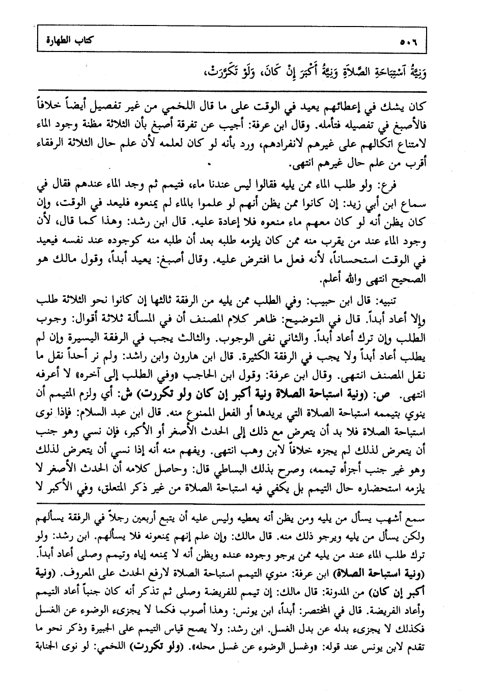 تنبيه : قال ابن حبيب: وفي الطلب ممن يليه من الرفقة ثالثها إن كانوا نحو الثلاثة طلب وإلا أعاد أبدا قال في التوضيح: ظاهر كلام المصنف أن في المسألة ثلاثة أقوال وجوب الطلب وإن ترك أعاد أبدا والثاني نفى الوجوب والثالث يجب في الرفقة اليسيرة وإن لم يطلب أعاد أبدا ولا يجب في الرفقة الكثيرة قال ابن هارون وابن راشد: ولم نر أحدا نقل ما نقل المصنف انتهى. وقال ابن عرفة: وقول ابن الحاجب وفي الطلب إلى آخره لا أعرفه انتهى. ص: "ونية استباحة الصلاة ونية أكبر إن كان ولو تكررت" ش: أي ولزم المتيمم أن ينوي بتيممه استباحة الصلاة التي يريدها أو الفعل الممنوع منه قال ابن عبد السلام: فإذا نوى استباحة الصلاة فلا بد أن يتعرض مع ذلك إلى الحدث الأصغر أو الأكبر فإن نسي وهو جنب أن يتعرض لذلك خلافا لابن وهب انتهى. ويفهم منه أنه إذا نسي أن يتعرض لذلك وهو غير جنب أجزأه تيممه وصرح بذلك البساطي قال وحاصل كلامه أن الحدث الأصغر لا يلزمه استحضاره حال التيمم بل يكفي فيه استباحة الصلاة من غير ذكر المتعلق وفي الأكبر لا