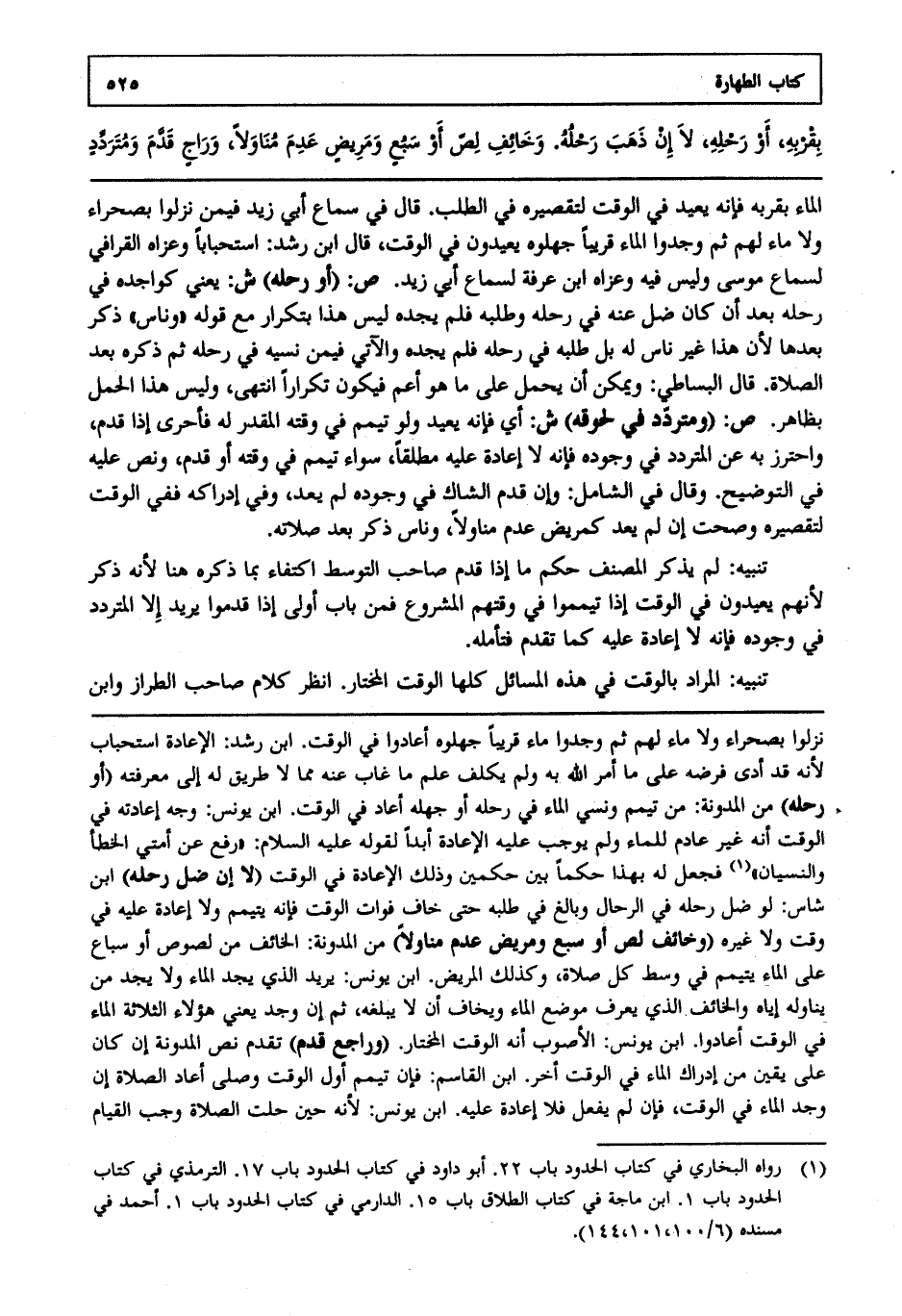 الماء بقربه فإنه يعيد في الوقت لتقصيره في الطلب قال في سماع أبي زيد فيمن نزلوا بصحراء ولا ماء لهم ثم وجدوا الماء قريبا جهلوه يعيدون في الوقت قال ابن رشد استحبابا وعزاه القرافي لسماع موسى وليس فيه وعزاه ابن عرفة لسماع أبي زيد ص: "أو رحله" ش: يعني كواجده في رحله بعد أن كان ضل عنه في رحله وطلبه فلم يجده ليس هذا بتكرار مع قوله وناس ذكر بعدها لأن ناس له بل طلبه في رحله فلم يجده والآتي فيمن نسيه في رحله ثم ذكره بعد الصلاة قال البساطي ويمكن أن يحمل على ما هو أعم فيكون تكرارا انتهى. وليس هذا الحمل بظاهر ص: "ومتردد في لحوقه" ش: أي فإنه يعيد ولو تيمم في وقته المقدر له فأحرى إذا قدم واحترز به عن المتردد في وجوده فإنه لا إعادة عليه مطلقا سواء تيمم في وقته أو قدم ونص عليه في التوضيح وقال في الشامل وإن قدم الشاك في وجوده لم يعد وفي إدراكه ففي الوقت لتقصيره وصحت إن لم يعد كمريض عدم مناولا وناس ذكر بعد صلاته.
