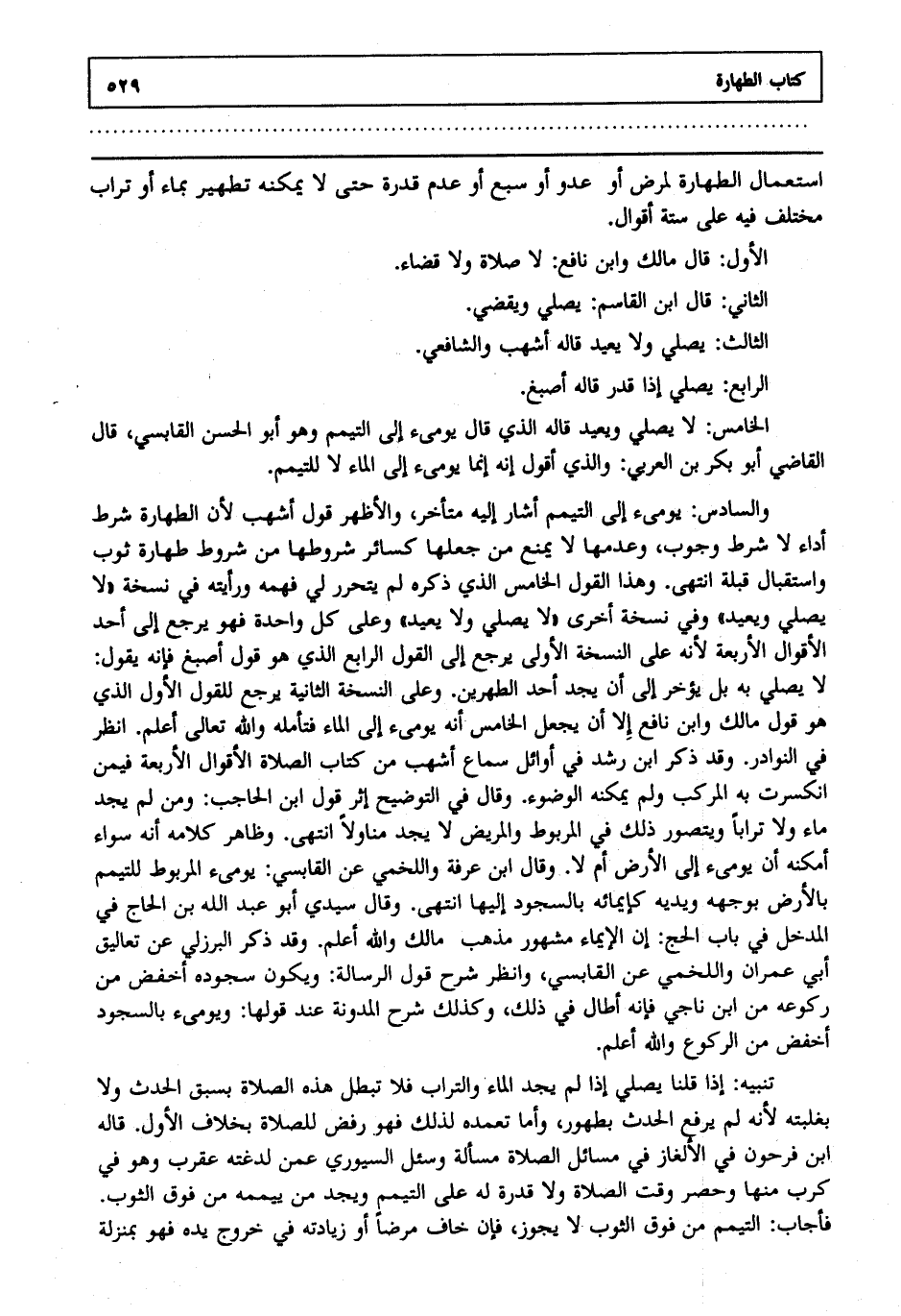 استعمال الطهارة لمرض أو عدو أو سبع أو عدم قدرة حتى لا يمكنه تطهير بماء أو تراب مختلف فيه على ستة أقوال: