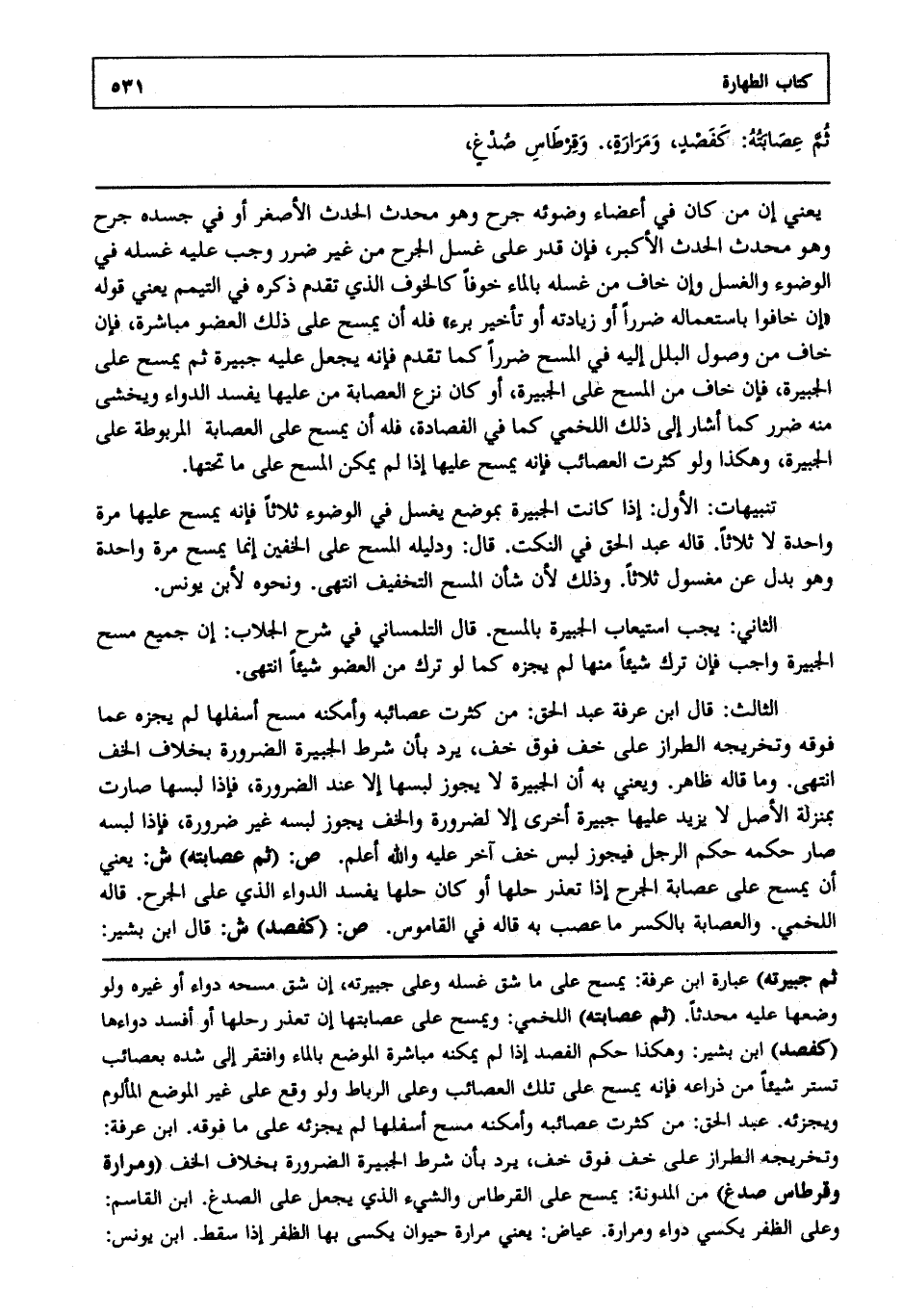 الثالث : قال ابن عرفة عبد الحق: من الغرماء عصائبه وأمكنه مسح أسفلها عما فوقه وتخريجه الطراز على خف فوق خف يرد بأن شرط الجبيرة الضرورة بخلاف الخف انتهى. وما قاله ظاهر ويعني به أن الجبيرة لا يجوز لبسها إلا عند الضرورة فإذا لبسها صارت بمنزلة الأصل لا يزيد عليها جبيرة أخرى إلا لضرورة والخف يجوز لبسه غير ضرورة فإذا لبسه صار حكمه حكم الرجل فيجوز لبس خف آخر عليه والله أعلم. ص: "ثم عصابته" ش: يعني أن يمسح على عصابة الجرح إذا تعذر حلها أو كان حلها يفسد الدواء الذي على الجرح قاله اللخمي والعصابة بالكسر ما عصب به قاله في القاموس ص: "كفصد" ش: قال ابن بشير: