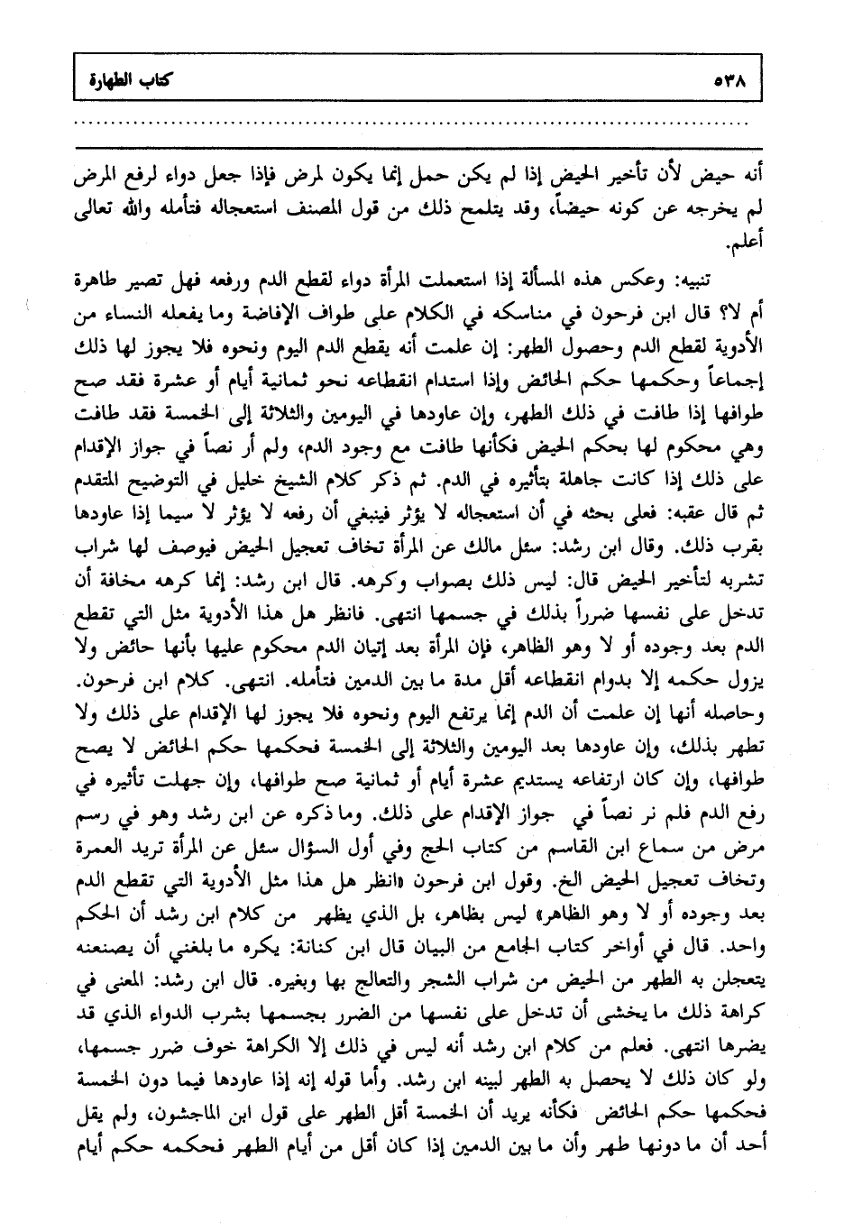 تنبيه : وعكس هذه المسألة إذا استعملت المرأة دواء لقطع الدم ورفعه فهل تصير طاهرة أم لا قال ابن فرحون في مناسكه في الكلام على طواف الإفاضة: وما يفعله النساء من الأدوية لقطع الدم وحصول الطهر إن علمت أنه يقطع الدم اليوم ونحوه فلا يجوز لها ذلك إجماعا وحكمها حكم الحائض وإذا استدام انقطاعه نحو ثمانية أيام أو عشرة فقد صح طوافها إذا طافت في ذلك الطهر وإن عاودها في اليومين والثلاثة إلى الخمسة فقد طافت وهي محكوم لها بحكم الحيض فكأنها طافت مع وجود الدم ولم أر نصا في جواز الإقدام على ذلك إذا كانت جاهلة بتأثيره في الدم ثم ذكر كلام الشيخ خليل في التوضيح المتقدم ثم قال عقبه فعلى بحثه في أن استعجاله لا يؤثر فينبغي أن رفعه لا يؤثر لا سيما إذا عاودها بقرب ذلك وقال ابن رشد: سئل مالك عن المرأة تخاف تعجيل الحيض فيوصف لها شراب تشربه لتأخير الحيض قال ليس ذلك بصواب وكرهه قال ابن رشد إنما كرهه مخافة أن تدخل على نفسها ضررا بذلك في جسمها انتهى. فانظر هل هذا الأدوية مثل التي تقطع الدم بعد وجوده أو لا وهو الظاهر فإن المرأة بعد إتيان الدم محكوم عليها بأنها حائض ولا يزول حكمه إلا بدوام انقطاعه أقل مدة ما بين الدمين فتأمله انتهى. كلام ابن فرحون وحاصله أنها إن علمت أن الدم إنما يرتفع اليوم ونحوه فلا يجوز لها الإقدام على ذلك ولا تطهر بذلك وإن عاودها بعد اليومين والثلاثة إلى الخمسة فحكمها حكم الحائض لا يصح طوافها وإن كان ارتفاعه يستديم عشرة أيام أو ثمانية صح طوافها وإن جهلت تأثيره في رفع الدم فلم نر نصا في جواز الإقدام على ذلك وما ذكره عن ابن رشد وهو في رسم مرض من سماع ابن القاسم من كتاب الحج وفي أول السؤال سئل عن المرأة تريد العمرة وتخاف تعجيل الحيض الخ وقول ابن فرحون انظر هل هذا مثل الأدوية التي تقطع الدم بعد وجوده أو لا وهو الظاهر ليس بظاهر بل الذي يظهر من كلام ابن رشد أن الحكم واحد قال في أواخر كتاب الجامع من البيان قال ابن كنانة يكره ما بلغني أن يصنعنه يتعجلن به الطهر من الحيض من شراب الشجر والتعالج بها وبغيره قال ابن رشد: المعنى في كراهة ذلك ما يخشى أن تدخل على نفسها من الضرر بجسمها بشرب الدواء الذي قد يضرها انتهى. فعلم من كلام ابن رشد أنه ليس في ذلك إلا الكراهة خوف ضرر جسمها ولو كان ذلك لا يحصل به الطهر لبينه ابن رشد وأما قوله إنه إذا عاودها فيما دون الخمسة فحكمها حكم الحائض فكأنه يريد أن الخمسة أقل الطهر على قول ابن الماجشون ولم يقل أحد أن ما دونها طهر وأن ما بين الدمين إذا كان أقل من أيام الطهر فحكمه حكم أيام