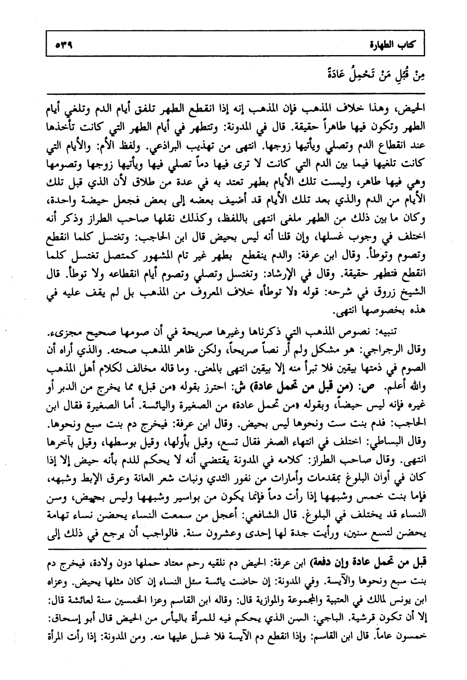 الحيض وهذا خلاف المذهب فإن المذهب إنه إذا انقطع الطهر تلفق أيام الدم وتلغي أيام الطهر وتكون فيها طاهرا حقيقة قال في المدونة: وتتطهر في أيام الطهر التي كانت تأخذها ثم انقطاع الدم وتصلي ويأتيها زوجها انتهى. من تهذيب البراذعي ولفظ الأم والأيام التي كانت تلغيها فيما بين الدم التي كانت لا ترى فيها دما تصلي فيها ويأتيها زوجها وتصومها وهي فيها طاهر وليست تلك الأيام بطهر تعتد به في عدة من طلاق لأن الذي قبل تلك الأيام من الدم والذي بعد تلك الأيام قد أضيف بعضه إلى بعض فجعل حيضة واحدة وكان ما بين ذلك من الطهر ملغى انتهى. باللفظ وكذلك نقلها صاحب الطراز وذكر أنه اختلف في وجوب غسلها وإن قلنا أنه ليس بحيض قال ابن الحاجب وتغتسل كلما انقطع وتصوم وتوطأ وقال ابن عرفة والدم ينقطع بطهر غير تام المشهور كمتصل تغتسل كلما انقطع فتطهر حقيقة وقال في الإرشاد وتغتسل وتصلي وتصوم أيام انقطاعه ولا توطأ قال الشيخ زروق في شرحه قوله: لا توطأ خلاف المعروف من المذهب بل لم يقف عليه في هذه بخصوصها انتهى. تنبيه: نصوص المذهب التي ذكرناها وغيرها صريحة في أن صومها صحيح مجزئ وقال الرجراجي هو مشكل ولم أر نصا صريحا ولكن ظاهر المذهب صحته والذي أراه أن الصوم في ذمتها بيقين فلا تبرأ منه إلا بيقين انتهى. بالمعنى وما قاله مخالف لكلام أهل المذهب والله أعلم. ص: "من قبل من تحمل عادة" ش: احترز بقوله من قبل مما يخرج من الدبر أو غيره فإنه ليس حيضا وبقوله من تحمل عادة من الصغيرة واليائسة أما الصغيرة فقال ابن الحاجب فدم بنت ست ونحوها ليس بحيض وقال ابن عرفة: فيخرج دم بنت سبع ونحوها وقال البساطي اختلف في انتهاء الصغر فقال تسع وقيل بأولها وقيل بوسطها وقيل بآخرها انتهى. وقال صاحب الطراز كلامه في المدونة يقتضي أنه لا يحكم للدم بأنه حيض إلا إذا كان في أوان البلوغ بمقدمات وأمارات من نفور الثدي ونبات شعر العانة وعرق الإبط وشبهه فإما بنت خمس وشبهها إذا رأت دما فإنما يكون من بواسير وشبهها وليس بحيض وسن النساء قد يختلف في البلوغ قال الشافعي: أعجل من سمعت النساء يحضن نساء تهامة يحضن لتسع سنين ورأيت جدة لها إحدى وعشرون سنة فالواجب أن يرجع في ذلك إلى