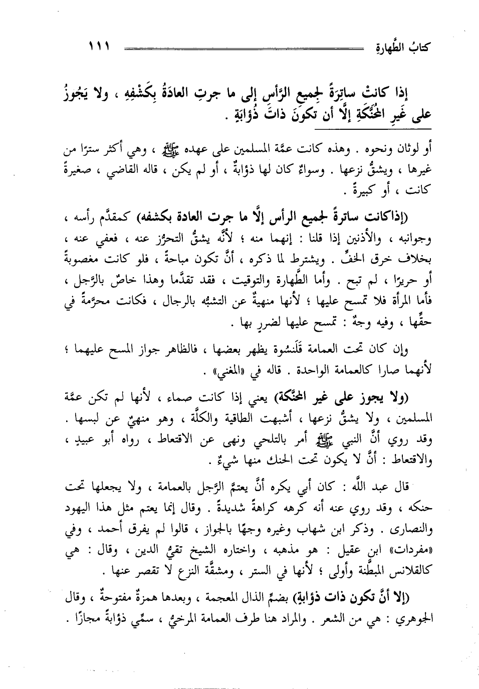 "إلا أن تكون ذات ذؤابة" بضم الذال المعجمة وبعدها همزة مفتوحة وقال الجوهري هي من الشعر والمراد هنا طرف العمامة المرخي سمي ذؤابة مجازا
