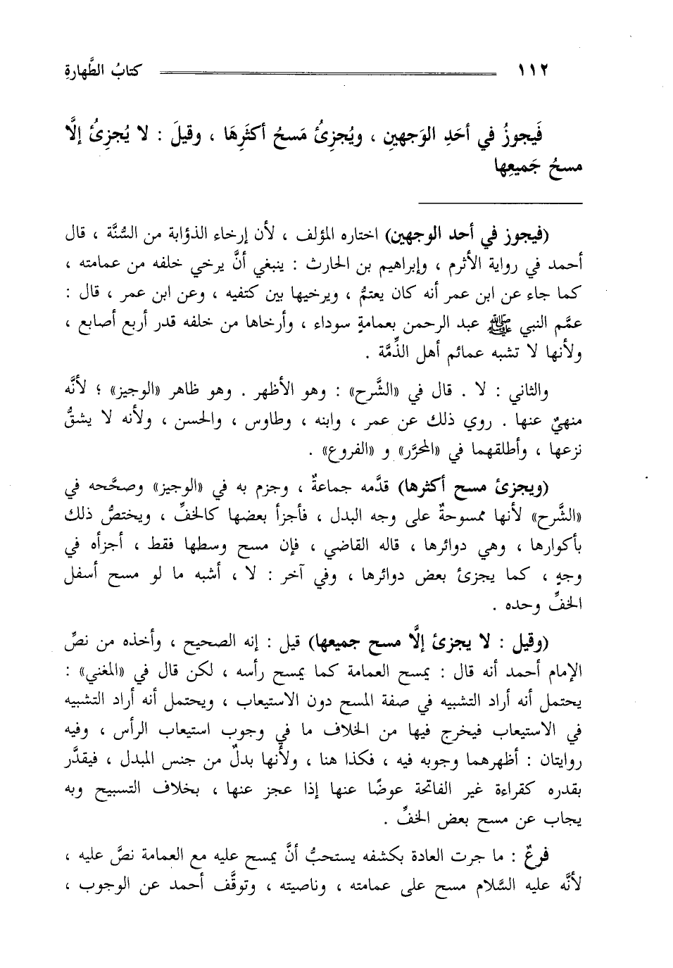 "ويجزئ مسح أكثرها" قدمه جماعة وجزم به في الوجيز وصححه في الشرح لأنها ممسوحة على وجه البدل فأجزأ بعضها كالخف ويختص ذلك بأكوارها وهي دوائرها قاله القاضي فإن مسح وسطها فقط أجزأه في وجه كما يجزئ بعض دوائرها وفي آخر لا أشبه ما لو مسح اسفل الخف وحده.
