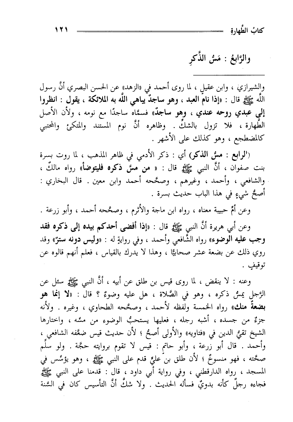 وعنه لا ينقض لما روى قيس بن طلق عن أبيه "أن النبي صلى الله عليه وسلم سئل عن الرجل يمس ذكره وهو في الصلاة هل عليه وضوء قال: "لا إنما هو بضعة منك" رواه الخمسة ولفظه لأحمد وصححه الطحاوي وغيره ولأنه جزء من جسده أشبه رجله فعليها يستحب الوضوء من مسه واختارها الشيخ تقي الدين في فتاويه والأولى أصح لأن حديث قيس ضعفه الشافعي وأحمد قال أبو زرعة وأبو حاتم قيس لا تقوم بروايته حجة ولو سلم صحته فهو منسوخ لأن طلق بن علي قدم على النبي صلى الله عليه وسلم وهو يؤسس في المسجد" رواه الدارقطني وفي رواية أبي داود قال "قدمنا على النبي صلى الله عليه وسلم فجاءه رجل كأنه بدوي فسأله" الحديث ولا شك ن التأسيس كان في السنه