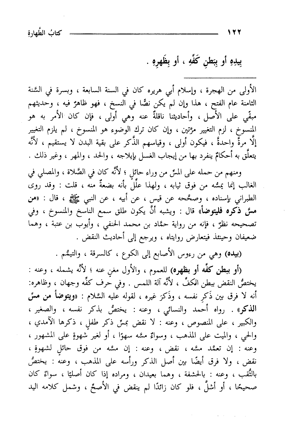 "أو ببطن كفه أو بظهره" للعموم والأول مغن عنه لأنه يشمله وعنه يختص النقض ببطن الكف لأنه آلة اللمس وفي حرف كفه وجهان وظاهره أنه لا فرق بين ذكر نفسه وذكر غيره لقوله عليه السلام: "ويتوضأ من مس الذكر" رواه أحمد والنسائي وعنه يختص بذكر نفسه والصغير والكبير على المنصوص وعنه لا نقض بمس ذكر طفل ذكرها الآمدي والحي والميت على المذهب وسواء مسه سهوا أو لغير شهوة على المشهور وعنه إن تعمد مسه نقض وعنه إن مسه من فوق حائل لشهوة نقض ولا فرق أيضا بين أصل الذكر ورأسه على المذهب وعنه يختص بالثقب وعنه بالحشفة وهما بعيدان ومراده إذا كان أصليا سواء كان صحيحا أو أشل فلو كان زائدا لم ينقض في الأصح وشمل كلامه اليد