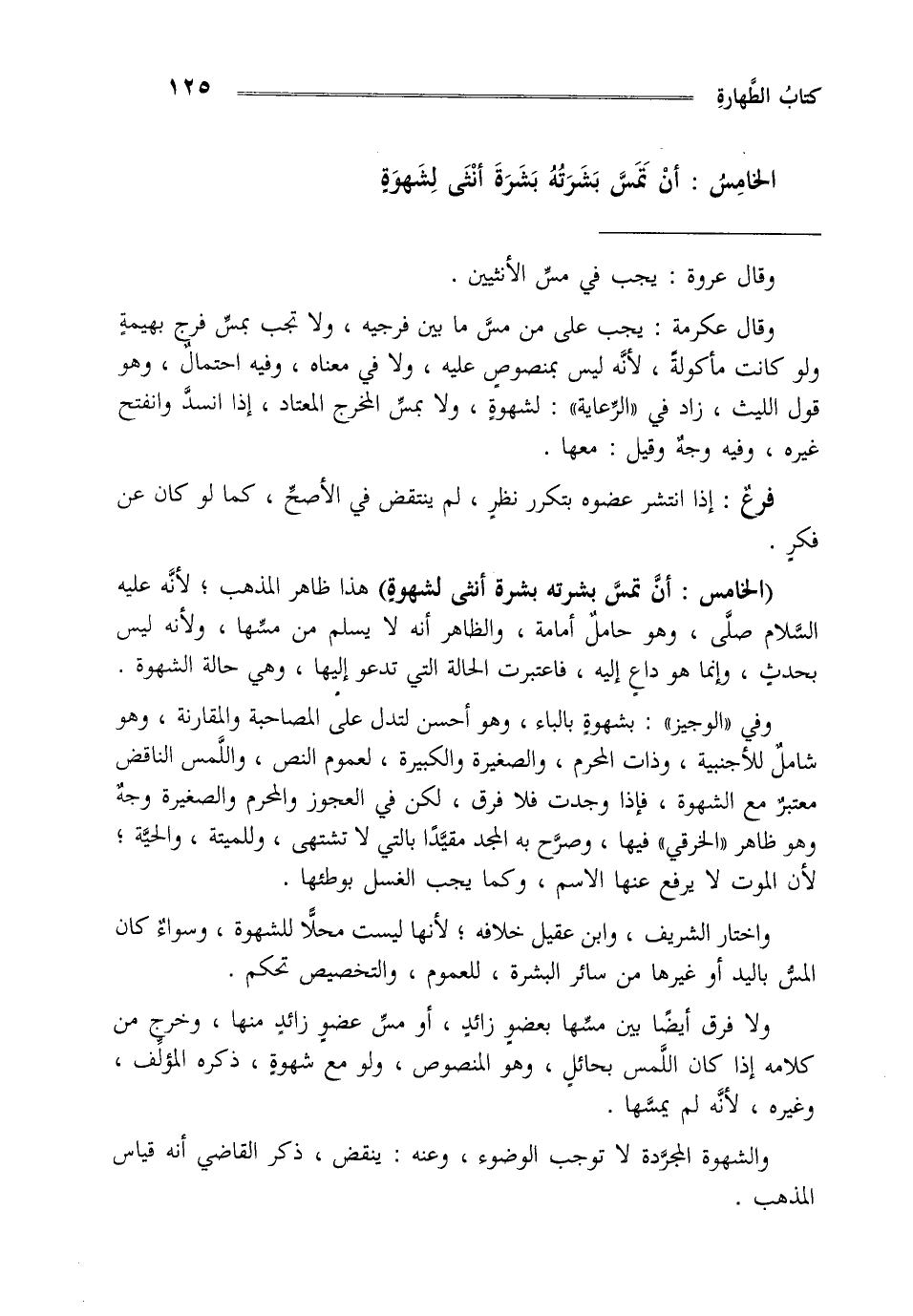 "الخامس أن تمس بشرته بشرة أنثى لشهوة" هذا ظاهر المذهب لأنه عليه السلام صلى وهو حامل أمامة والظاهر أنه لا يسلم من مسها ولأنه ليس بحدث وإنما هو داع إليه فاعتبرت الحالة التي تدعو إليها وهي حالة الشهوة