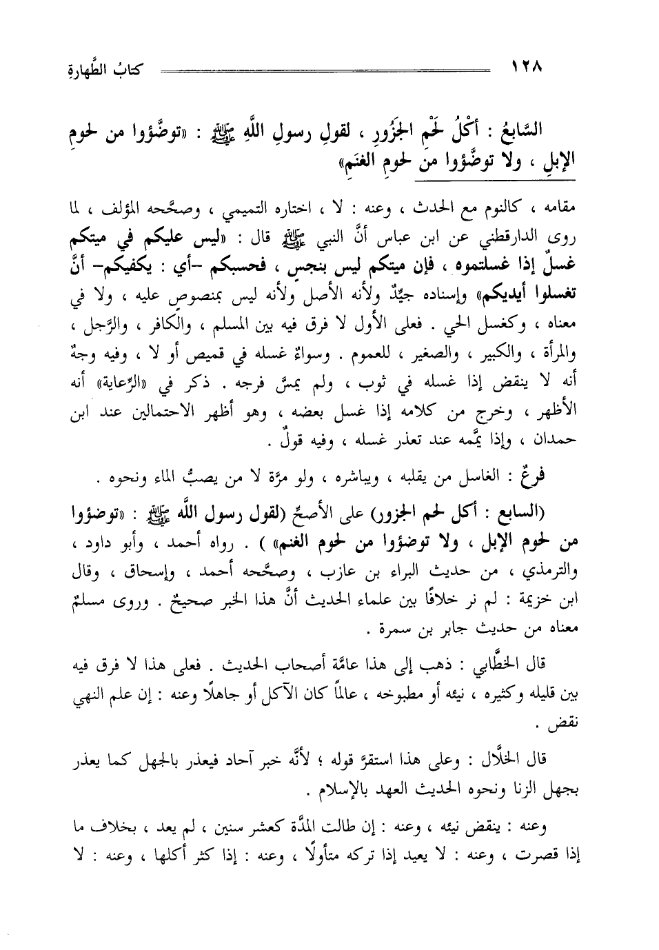 "السابع: أكل لحم الجزور" على الأصح لقول رسو الله صلى الله عليه وسلم "توضؤوا من لحوم الإبل ولا توضؤوا من لحوم الغنم" رواه أحمد وأبو داود والترمذي من حديث البراء بن عازب وصححه أحمد وإسحاق وقال ابن خزيمة لم نر خلافا بين علماء الحديث أن هذا الخبر صحيح وروى مسلم معناه من حديث جابر بن سمرة.