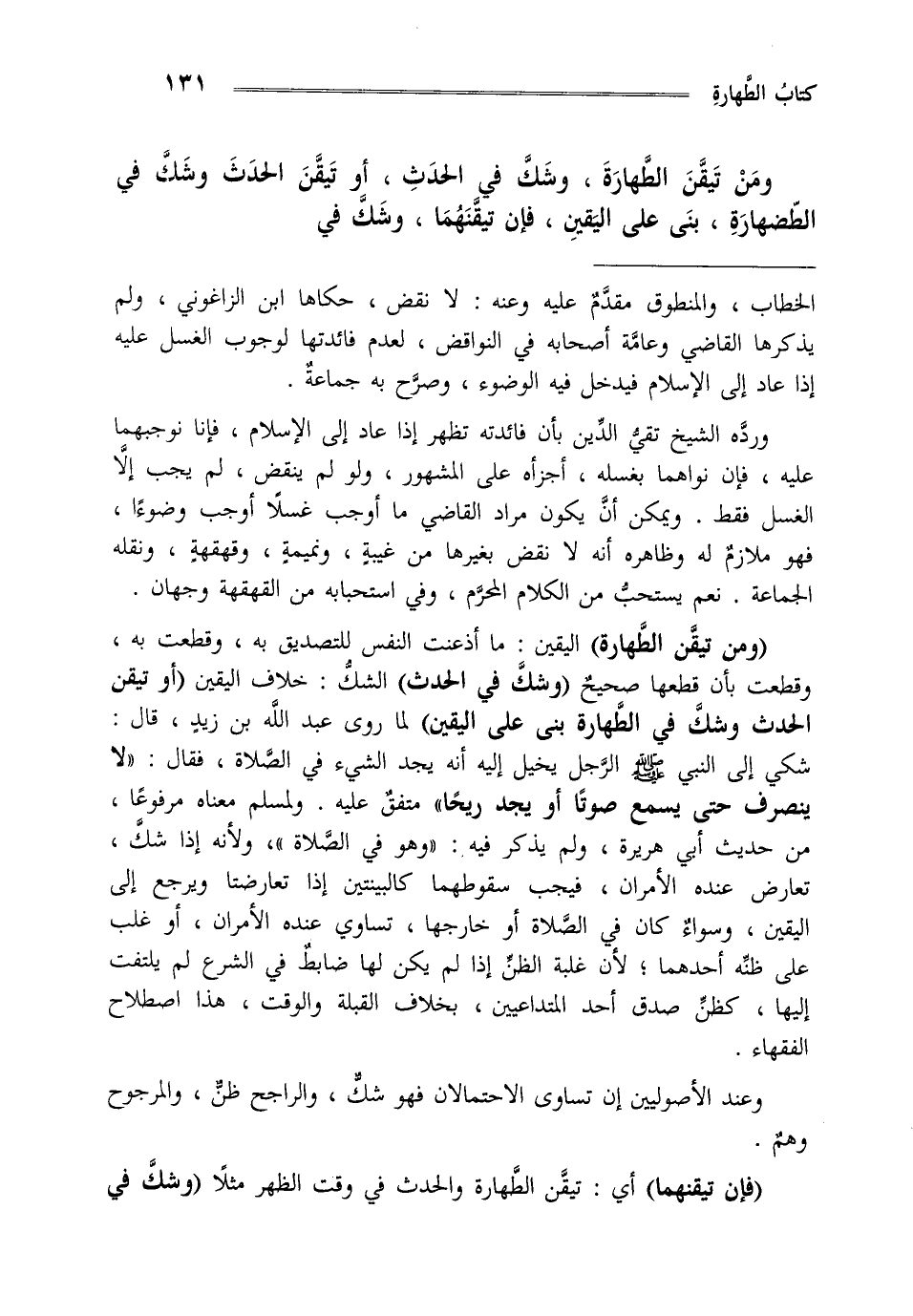 "ومن تيقن الطهارة" اليقين ما أذعنت النفس للتصديق به وقطعت به وقطعت بأن قطعها صحيح "وشك في الحدث" الشك خلاف اليقين "أو تيقن الحدث وشك في الطهارة بنى على اليقين" لما روى عبد الله بن زيد قال شكى إلى النبي صلى الله عليه وسلم الرجل يخيل إليه أنه يجد الشيء في الصلاة فقال: "لا ينصرف حتى يسمع صوتا أو يجد ريحا" متفق عليه ولمسلم معناه مرفوعا من حديث أبي هريرة ولم يذكر فيه وهو في الصلاة ولأنه إذا شك تعارض عنده الأمران فيجب سقوطهما كالبينتين إذا تعارضتا ويرجع إلى اليقين وسواء كان في الصلاة أو خارجها تساوي عنده الأمران أو غلب على ظنه أحدهما لأن غلبة الظن إذا لم يكن لها ضابط في الشرع لم يلتفت إليها كظن صدق أحد المتداعيين بخلاف القبلة والوقت هذا اصطلاح الفقهاء