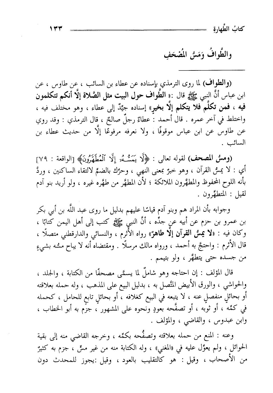 وجوابه بأن المراد هم وبنو آدم قياسا عليهم بدليل ما روى عبد الله بن أبي بكر بن عمرو بن حزم عن أبيه عن جده أن النبي صلى الله عليه وسلم كتب إلى أهل اليمن كتابا وكان فيه "لا يمس القرآن إلا طاهر" رواه الأثرم والنسائي والدارقطني متصلا قال الأثرم واحتج به أحمد ورواه مالك مرسلا ومقتضاة أنه لا يباح مسه بشيء من جسده حتى يتطهر ولو بتيمم قال المؤلف إن احتاجه وهو شامل لما يسمى مصحفا من الكتابة والجلد والحواشي والورق الأبيض المتصل به بدليل البيع على المذهب وله حمله بعلاقته أو بحائل منفصل عنه لا يتبعه في البيع كغلافه أو بحائل تابع للحامل كحمله في كمه أو ثوبه أو تصفحه بعود ونحوه على المشهور جزم به أبو الخطاب وابن عبدوس والقاضي والمؤلف