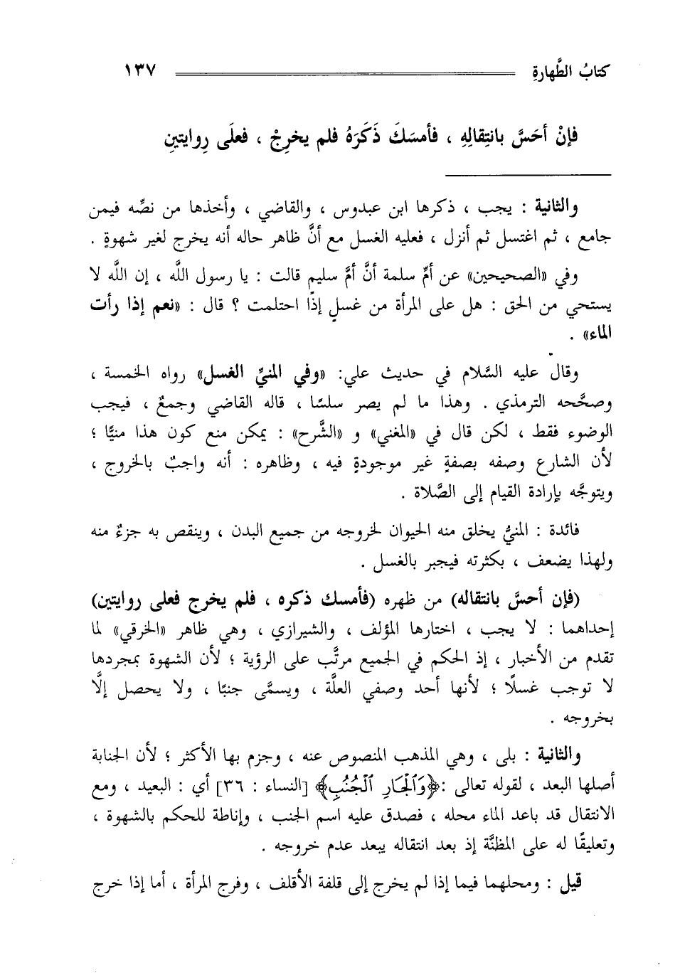 "فإن أحس بانتقاله" من ظهره "فأمسك ذكره فلم يخرج فعلى روايتين" إحداهما لا يجب اختارها المؤلف والشيرازي وهي ظاهر الخرقي لما تقدم من الأخبار إذ الحكم في الجميع مرتب على الرؤية لأن الشهوة بمجردها لا توجب غسلا لأنها أحد وصفي العلة ويسمى جنبا ولا يحصل إلا بخروجه وإن خرج بعد الغسل أو خرجت بقية المني لم يجب الغسل والثانية: بلى وهي المذهب المنصوص عنه وجزم بها الأكثر لأن الجنابة أصلها البعد لقوله تعالى {وَالْجَارِ الْجُنُبِ} [النساء: 36] أي البعيد ومع الانتقال قد باعد الماء محله فصدق عليه اسم الجنب وإناطة للحكم بالشهوة وتعليقا له على المظنة إذ بعد انتقاله يبعد عدم خروجه قيل ومحلهما فيما إذا لم يخرج إلى قلفة الأقلف وفرج المرأة أما إذا خرج