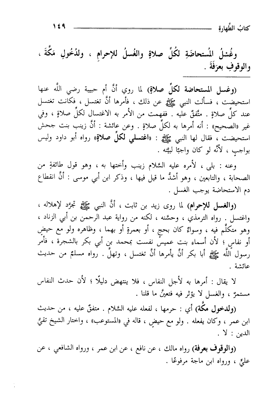 "وغسل المستحاضة لكل صلاة" لما روي "أن أم حبيبة رضي الله عنها استحيضت فسألت النبي صلى الله عليه وسلم عن ذلك فأمرها أن تغتسل فكانت تغتسل عند كل صلاة" متفق عليه ففهمت من الأمر به الاغتسال لكل صلاة وفي غير الصحيح أنه أمرها به لكل صلاة وعن عائشة "أن زينب بنت جحش استحيضت فقال لها النبي صلى الله عليه وسلم اغتسلي لكل صلاة" رواه أبو داود وليس بواجب لأنه لو كان واجبا لبينه.