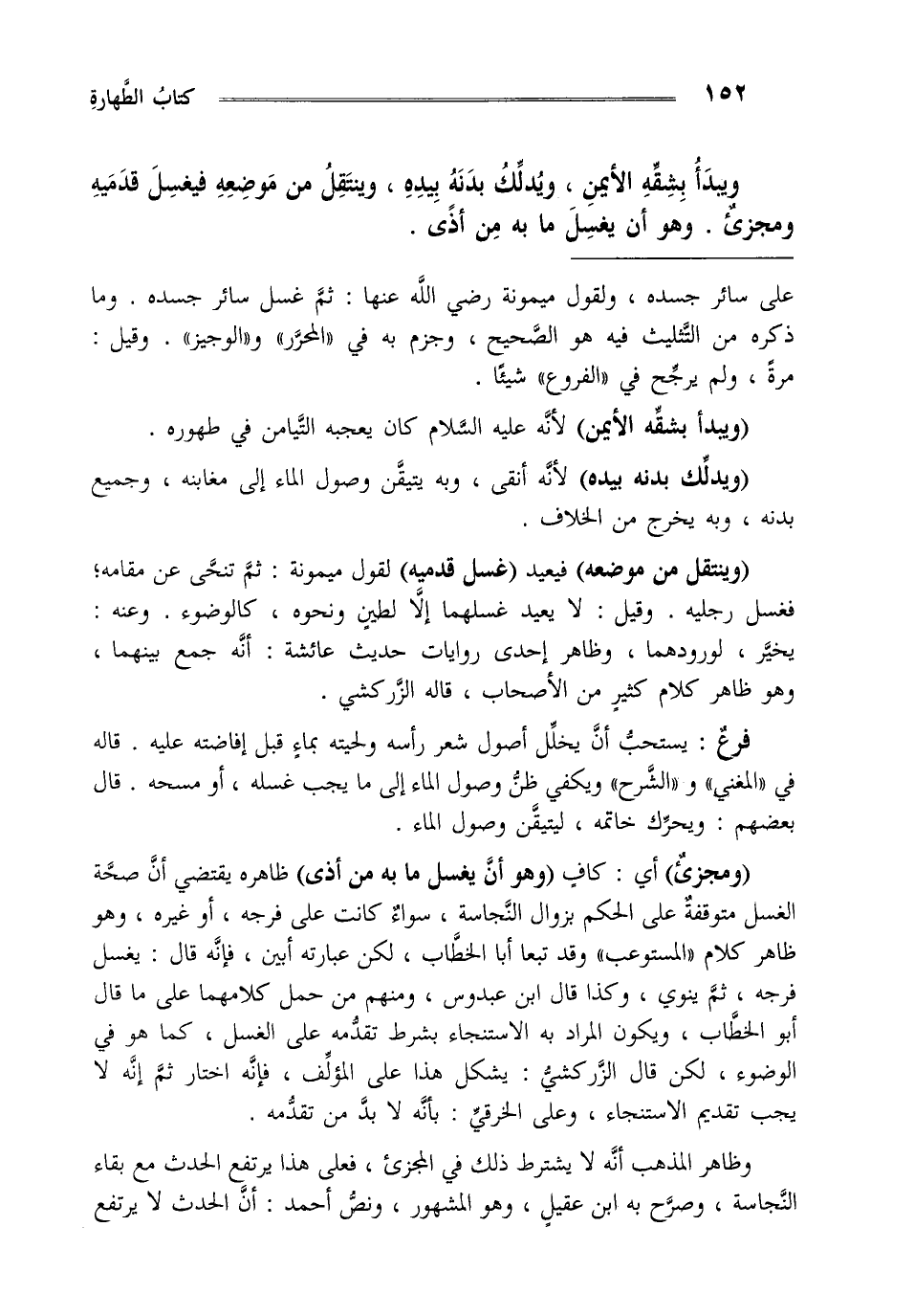 ويبدأ بشقه الأيمن ويدلك بدنه بيده وينتقل من موضعه فيغسل قدميه، ومجزئ وهو أن يغسل مابه من أذى