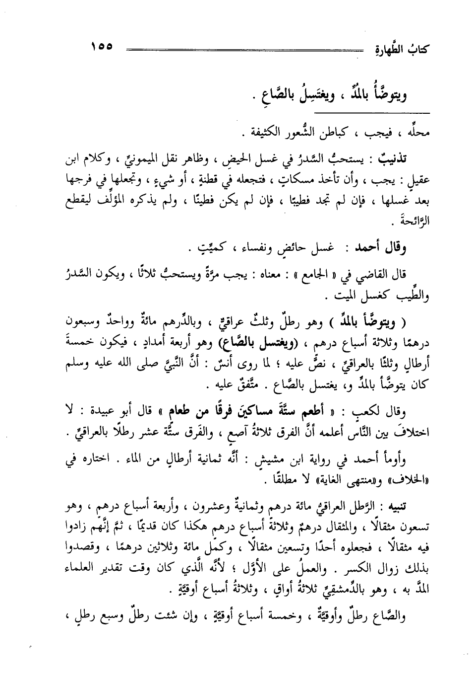 قال القاضي في الجامع معناه يجب مرة ويستحب ثلاثا ويكون السدر والطيب كغسل الميت "ويتوضأ بالمد" وهو رطل وثلث عراقي وبالدرهم مائة وواحد وسبعون درهما وثلاثة أسباع درهم "ويغتسل بالصاع" وهو أربعة أمداد فيكون خمسة أرطال وثلثا بالعراقي نص عليه لما روى أنس أن النبي صلى الله عليه وسلم كان يتوضأ بالمد ويغتسل بالصاع متفق عليه وقال لكعب "أطعم ستة مساكين فرقا من طعام" قال أبو عبيدة لا اختلاف بين الناس أعلمه أن الفرق ثلاثة آصع والفرق ستة عشر رطلا بالعراقي.