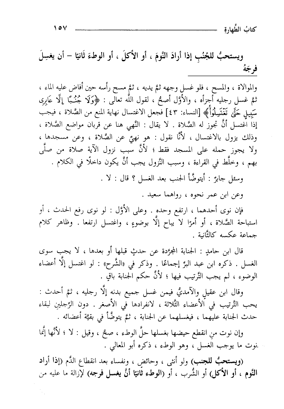 "ويستحب للجنب" ولو أنثى وحائض ونفساء بعد انقطاع الدم "إذا أراد النوم أو الأكل" أو الشرب أو "الوطء ثانيا أن يغسل فرجه" لإزالة ما عليه من.