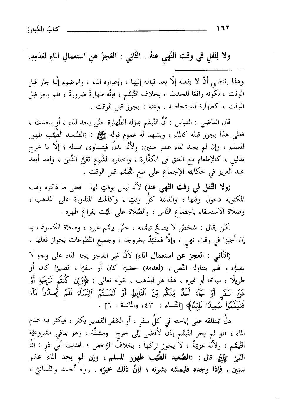 ولا لنفل في وقت النهي عنه، الثاني العجز عن استعمال الماء لعدم