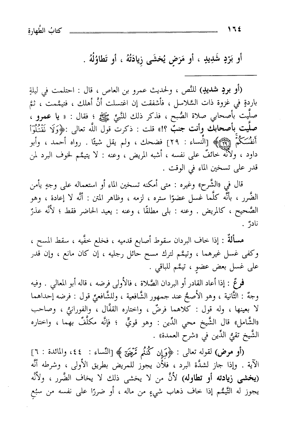 "أو برد شديد" للنص ولحديث عمرو بن العاص قال "احتلمت في ليلة باردة في غزوة ذات السلاسل فأشفقت إن اغتسلت أن أهلك فتيممت ثم صليت بأصحابي صلاة الصبح فذكر ذلك للنبي صلى الله عليه وسلم فقال "يا عمرو صليت بأصحابك وأنت جنب" قلت ذكرت قول الله تعالى {وَلا تَقْتُلُوا أَنْفُسَكُمْ} [النساء: 29] فضحك ولم يقل شيئا" رواه أحمد وأبو داود ولأنه خائف على نفسه أشبه المريض وعنه لا يتيمم لخوف البرد لمن قدر على تسخين الماء في الوقت.