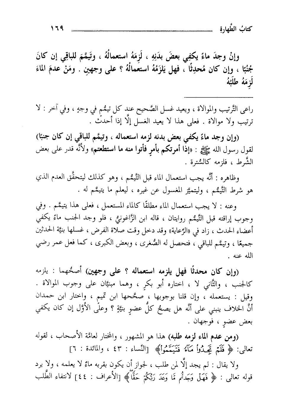 "ومن عدم الماء لزمه طلبه" هذا هو المشهور والمختار لعامة الأصحاب لقوله تعالى {فَلَمْ تَجِدُوا مَاءً فَتَيَمَّمُوا} [النساء: 43 والمائدة: 6].