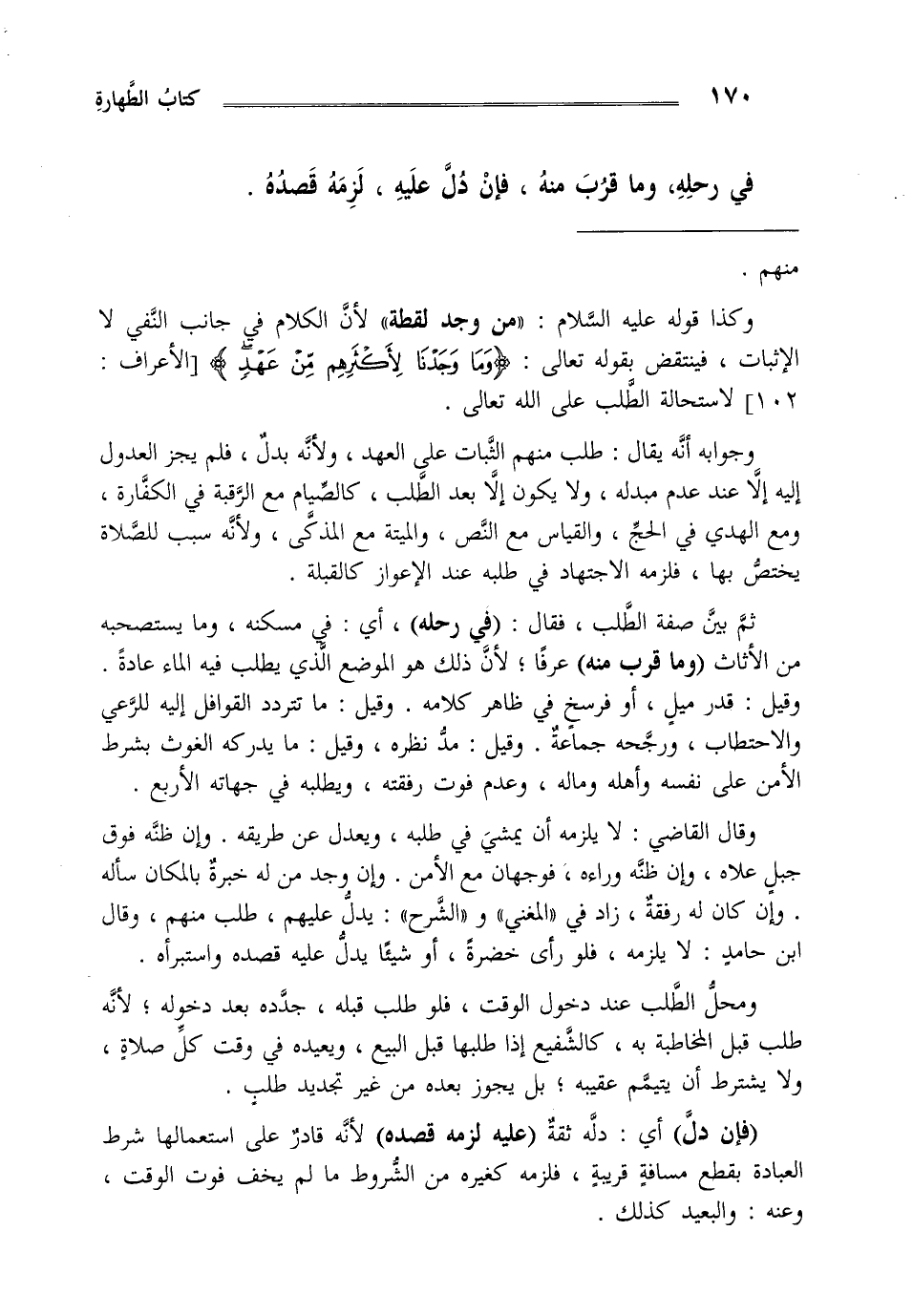ثم بين صفة الطلب فقال "في رحله" أي في مسكنه وما يستصحبه من الأثاث "وما قرب منه" عرفا لأن ذلك هو الموضع الذي يطلب فيه الماء عادة وقيل قدر ميل أو فرسخ في ظاهر كلامه وقيل ما تتردد القوافل إليه للرعي والاحتطاب ورجحه جماعة وقيل مد نظره وقيل ما يدركه الغوث بشرط الأمن على نفسه وأهله وماله وعدم فوت رفقته ويطلبه في جهاته الأربع.
