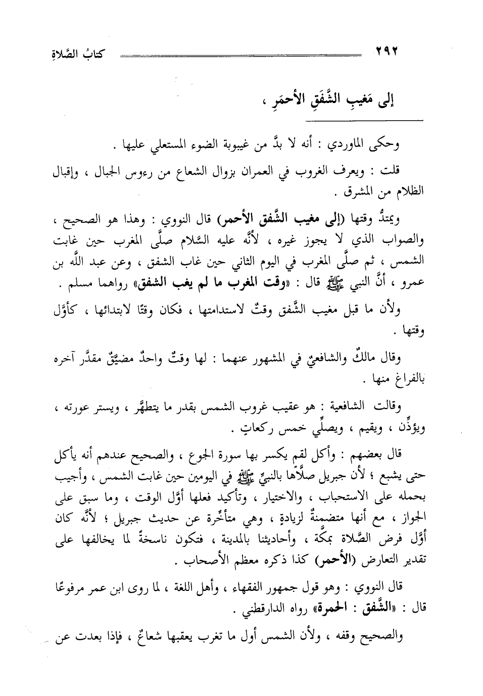 قال النووي وهو قول جمهور الفقهاء وأهل اللغة لما روى ابن عمر مرفوعا قال "الشفق الحمرة" رواه الدارقطني.