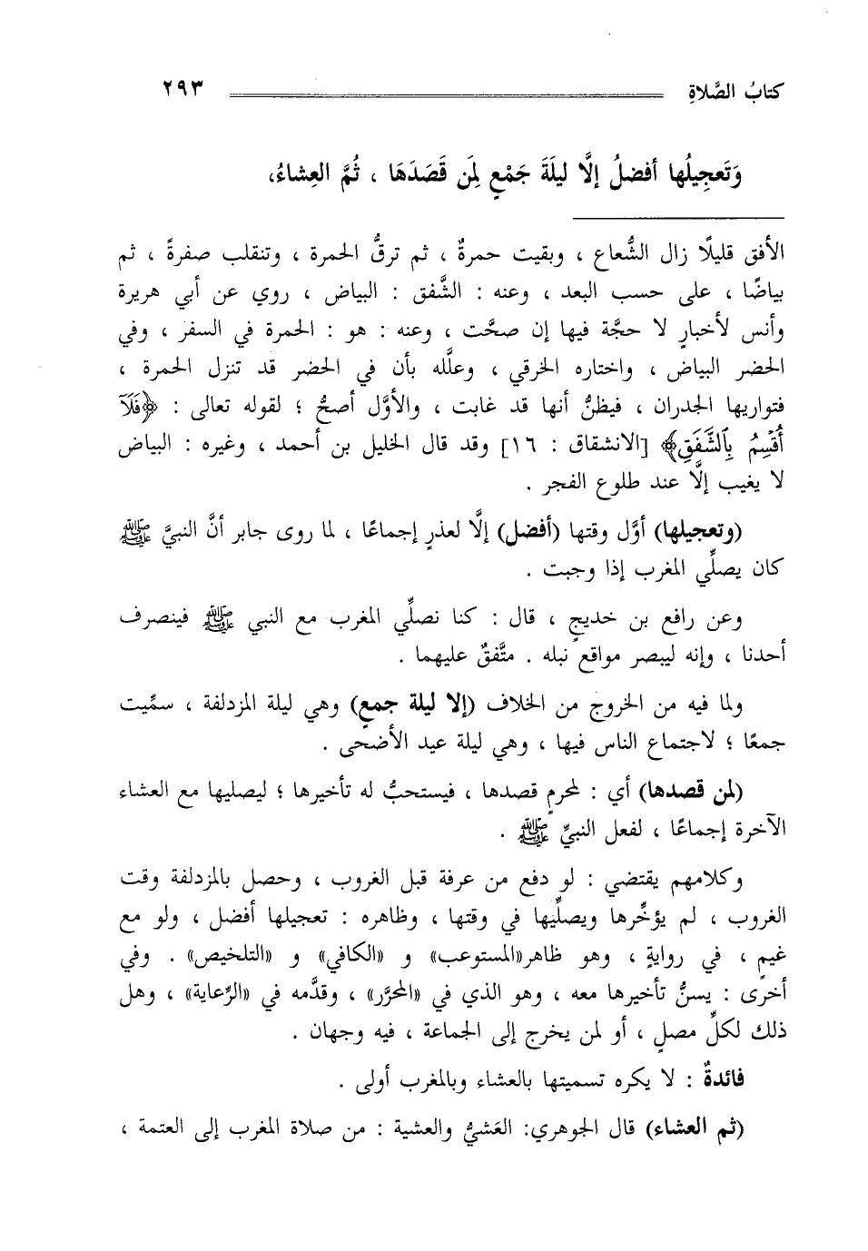 وتعجيلها أفضل إلا ليلة جمع لمن قصدها, ثم العشاء