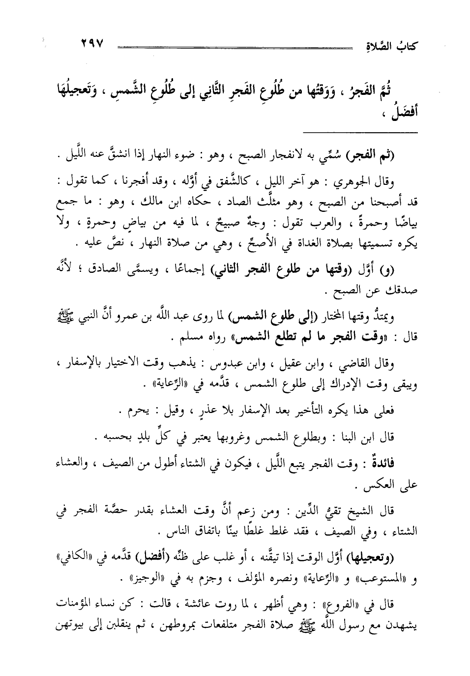 "ثم الفجر" سمي به لانفجار الصبح وهو ضوء النهار إذا انشق عنه الليل وقال الجوهري هو آخر الليل كالشفق في أوله وقد أفجرنا كما تقول قد أصبحنا من الصبح وهو مثلث الصاد حكاه ابن مالك وهو ما جمع بياضا وحمرة والعرب تقول وجه صبيح لما فيه من بياض وحمرة ولا يكره تسميتها بصلاة الغداة في الأصح وهي من صلاة النهار نص عليه