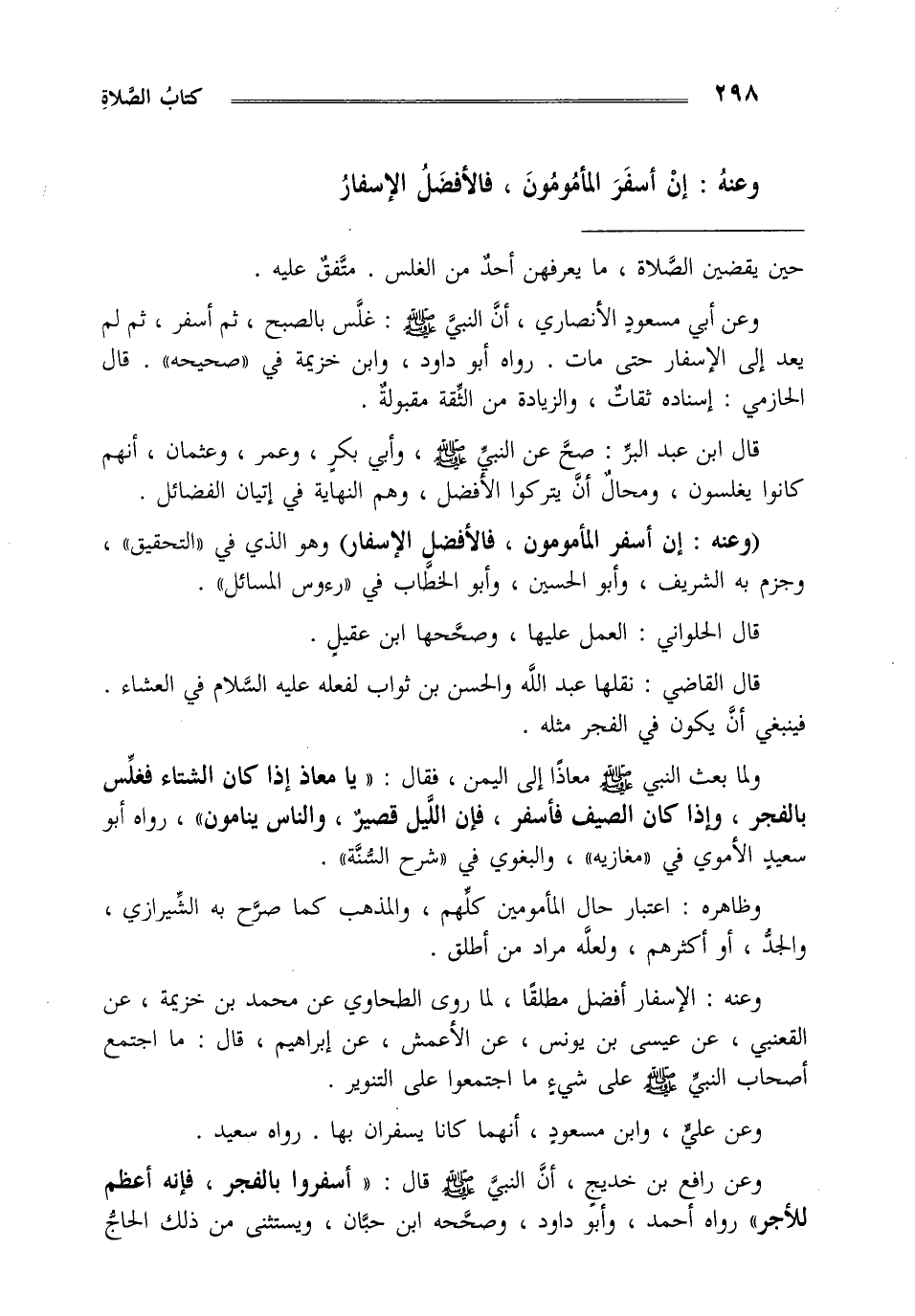وعن رافع بن خديج أن النبي صلى الله عليه وسلم قال "أسفروا بالفجر فإنه أعظم للأجر" رواه أحمد وأبو داود وصححه ابن حبان ويستثنى من ذلك الحاج