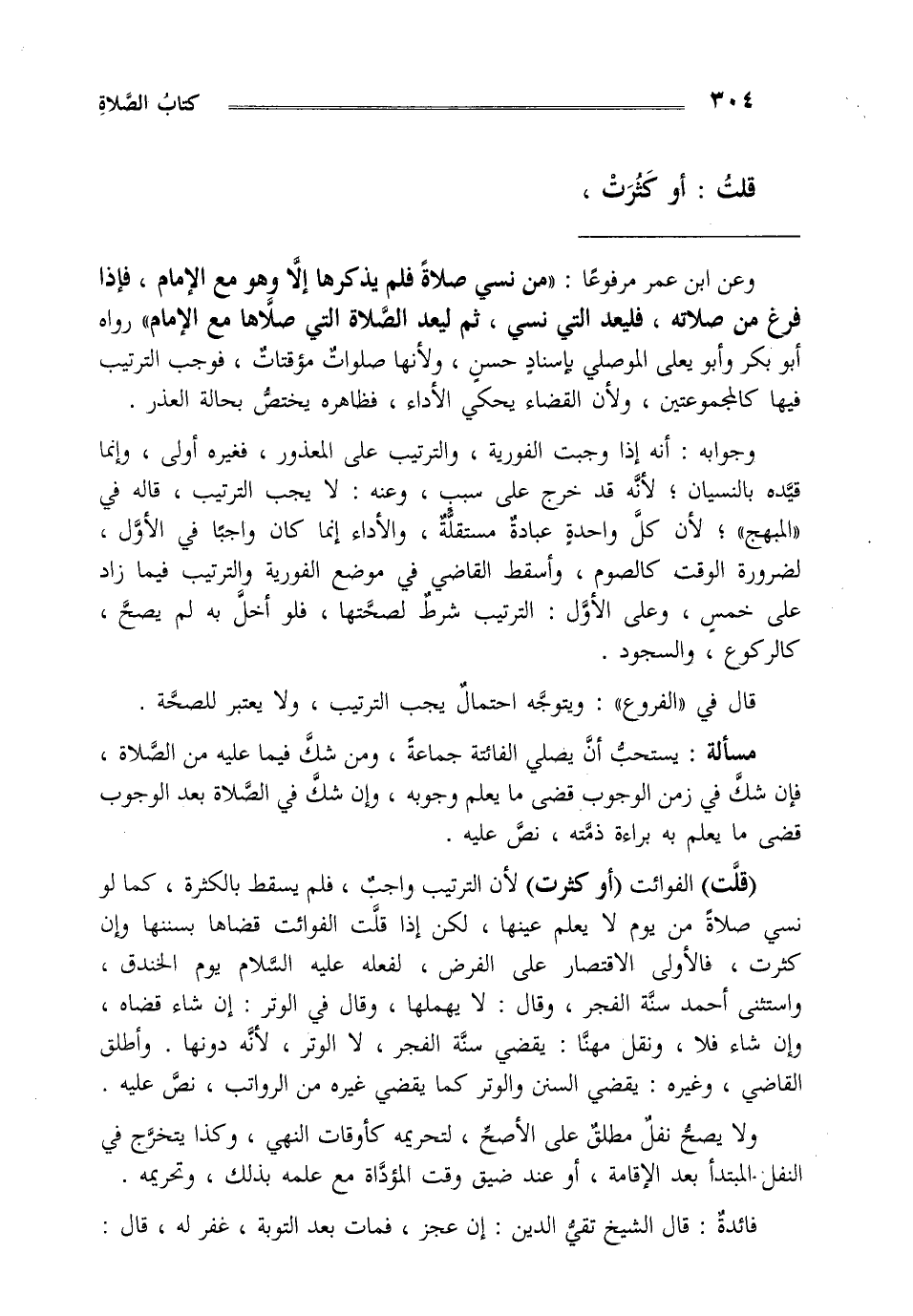 "قلت" الفوائت "أو كثرت" لأن الترتيب واجب فلم يسقط بالكثرة كما لو نسي صلاة من يوم لا يعلم عينها لكن إذا قلت الفوائت قضاها بسننها وإن كثرت فالأولى الاقتصار على الفرض لفعله عليه السلام يوم الخندق واستثنى أحمد سنة الفجر وقال لا يهملها وقال في الوتر إن شاء قضاه وإن شاء فلا ونقل مهنا يقضي سنة الفجر لا الوتر لأنه دونها وأطلق القاضي وغيره يقضي السنن والوتر كما يقضي غيره من الرواتب نص عليه ولا يصح نفل مطلق على الأصح لتحريمه كأوقات النهي وكذا يتخرج في النفل المبتدأ بعد الإقامة أو عند ضيق وقت المؤداة مع علمه بذلك وتحريمه.