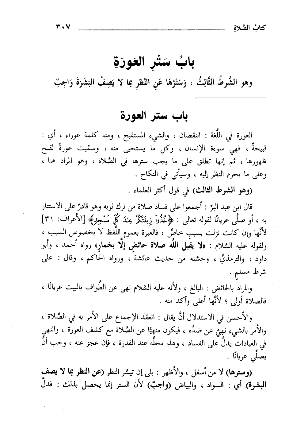 العورة في اللغة النقصان والشيء المستقبح ومنه كلمة عوراء أي قبيحة فهي سوءة الإنسان وكل ما يستحيى منه وسميت عورة لقبح ظهورها ثم إنها تطلق على ما يجب سترها في الصلاة وهو المراد هنا وعلى ما يحرم النظر إليه وسيأتي في النكاح.
