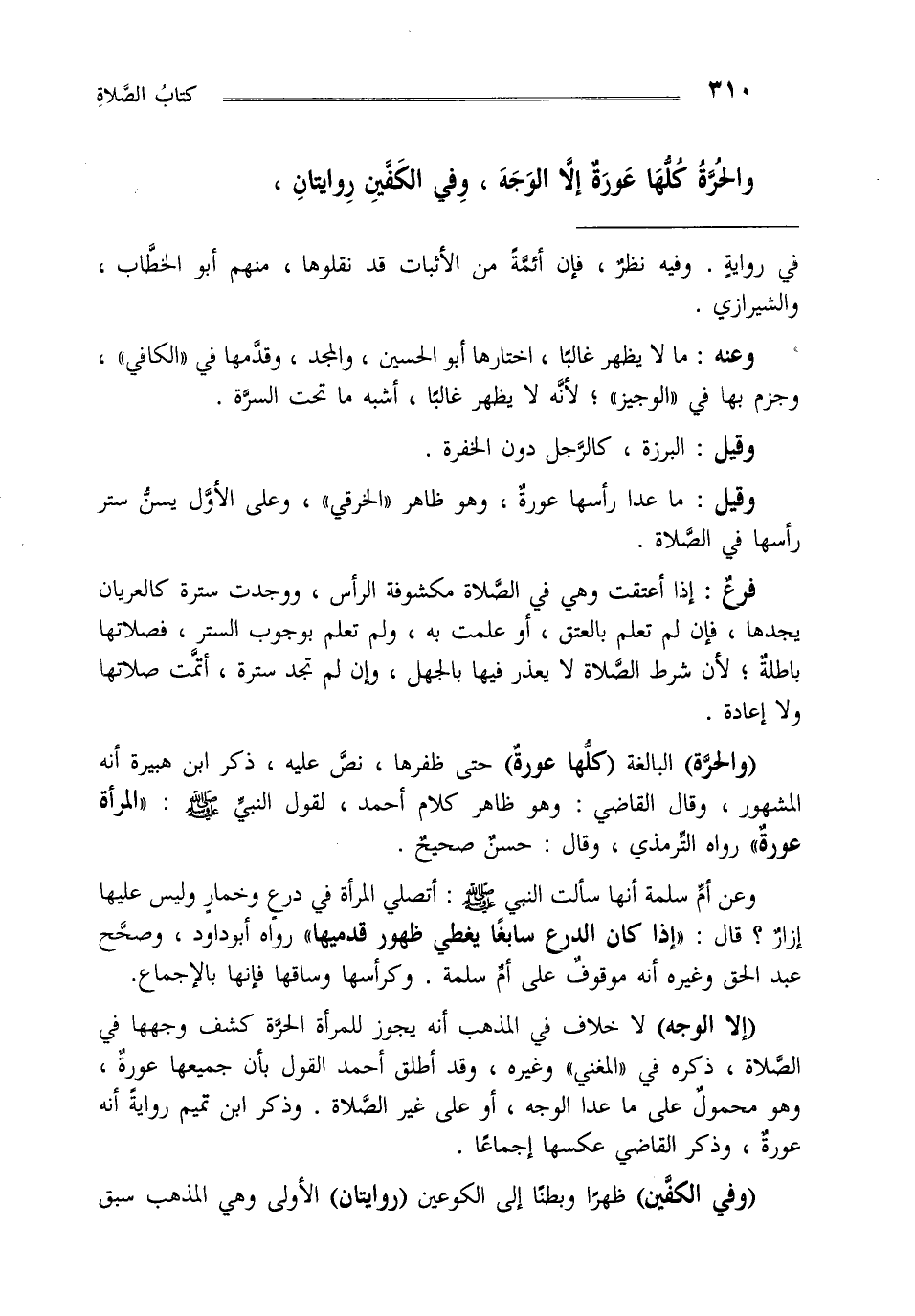 "إلا الوجه" لا خلاف في المذهب أنه يجوز للمرأة الحرة كشف وجهها في الصلاة ذكره في المغني وغيره وقد أطلق أحمد القول عورة وهو محمول على ما عدا الوجه أوعلى غيرالصلاة وذكر ابن تميم رواية أنه عورة وذكر القاضي عكسها إجماعا.