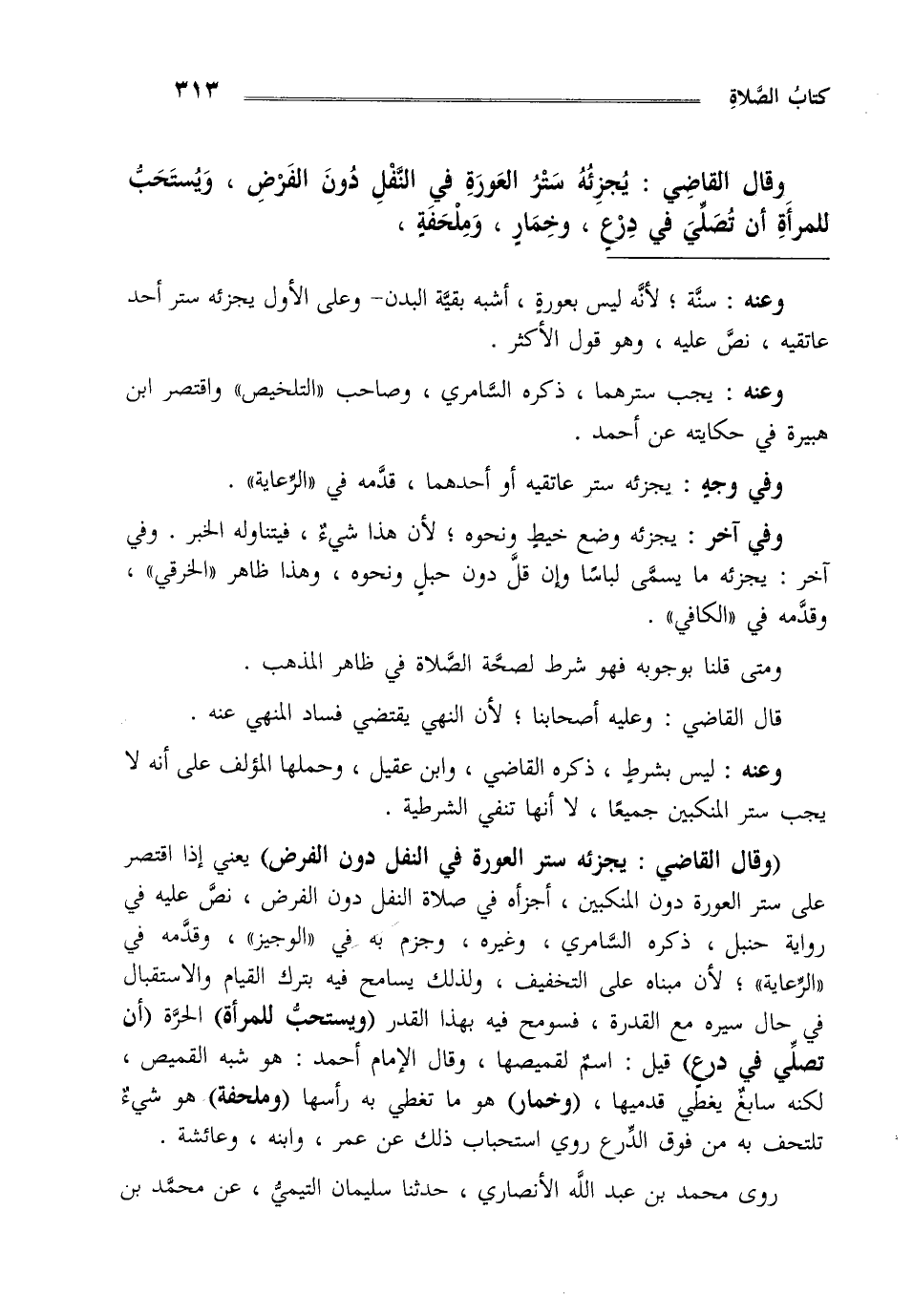 "وقال القاضي يجزئه ستر العورة في النفل دون الفرض" يعني إذا اقتصر على ستر العورة دون المنكبين أجزأه في صلاة النفل دون الفرض نص عليه في رواية حنبل ذكره السامري وغيره وجزم به في الوجيز وقدمه في الرعاية لأن مبناه على التخفيف ولذلك يسامح فيه بترك القيام والاستقبال في حال سيره مع القدرة فسومح فيه بهذا القدر "ويستحب للمرأة" الحرة "أن تصلي في درع" قيل اسم لقميصها وقال الإمام أحمد هو شبه القميص لكنه سابغ يغطي قدميها وخمار هو ما تغطي به رأسها "وملحفة" هو شيء تلتحف به من فوق الدرع روي استحباب ذلك عن عمر وابنه وعائشة.