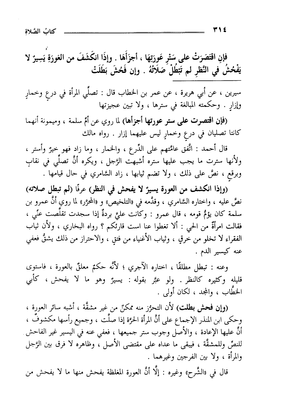 "وإذا انكشف من العورة يسير لا يفحش في النظر" عرفا "لم تبطل صلاته" نص عليه واختاره السامري وقدمه في التلخيص و المحرر لما روي أن عمرو بن سلمة كان يؤم قومه قال عمرو وكانت علي بردة إذا سجدت تقلصت عني فقالت امرأة من الحي ألا تغطوا عنا أست قارئكم رواه البخاري ولأن ثياب الفقراء لا تخلو من خرق وثياب الأغنياء من فتق والاحتراز من ذلك يشق فعفي عنه كيسير الدم