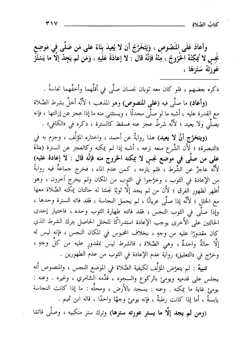 "ويتخرج أن لا يعيد" هذا رواية عن أحمد واختاره المؤلف وجزم به في التبصرة لأن الشرع منعه نزعه أشبه إذا لم يمكنه وكالعجز عن السترة "بناء على من صلى في موضع نجس لا يمكنه الخروج منه فإنه قال لا إعادة عليه" لأنه عاجز عن الشرط فلم يلزمه كمن عدم الماء فخرج جماعة فيه رواية من الإعادة في الثوب وخرجوا في الثوب من المكان ولم يخرج آخرون وهو أظهر لظهور الفرق لأن من لم يجد إلا ثوبا نجسا له حالتان يمكنه الصلاة معها مع الخلل لأنه إذا صلى عريانا لم يحمل النجاسة فقد فاته السترة وحدها وإذا صلى في الثوب النجس فقد فاتته طهارة الثوب وحده فاختيار إحدى الحالتين على الأخرى يوجب الإعادة استدراكا للخلل الحاصل بترك الشرط الذي كان مقدورا عليه من وجه بخلاف المحبوس في المكان النجس فإنه ليس له إلا حالة واحدة وهي الصلاة فالشرط ليس بمقدور عليه من كل وجه وخرج في التعليق رواية عدم الإعادة في الثوب من عدم الطهورين.