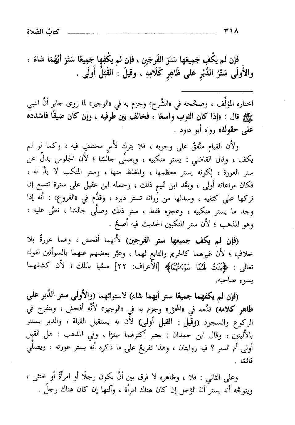 "فإن لم يكفهما جميعا ستر أيهما شاء" لاستوائهما "والأولى ستر الدبر على ظاهر كلامه" قدمه في المحرر وجزم به في الوجيز لأنه أفحش وينفرج في الركوع والسجود "وقيل القبل أولى" لأن به يستقبل القبلة والدبر يستتر بالأليتين وقال ابن حمدان يعتبر أكثرهما سترا وفي المذهب هل القبل أولى أم الدبر فيه روايتان وهذا تفريع على ما ذكره أنه يستر قائما.