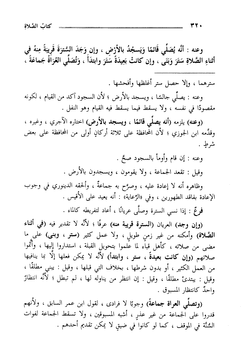وعنه أنه يصلي قائما ويسجد بالأرض وإن وجد السترة قريبة منه في أثناء الصلاة ستر وبنى وإن كانت بعيدة ستر وابتدأ وتصلي العراة جماعة