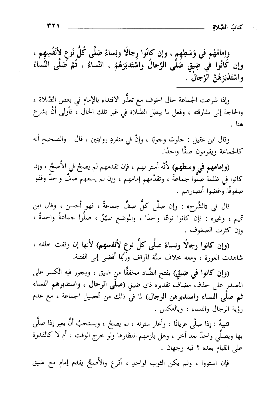وإمامهم في وسطهم وإن كانوا رجالا ونساء صلى كل نوع لأنفسهم وإن كانوا في ضيق صلى الرجال واستدبرهم النساء ثم صلى النساء واستدبرهن الرجال
