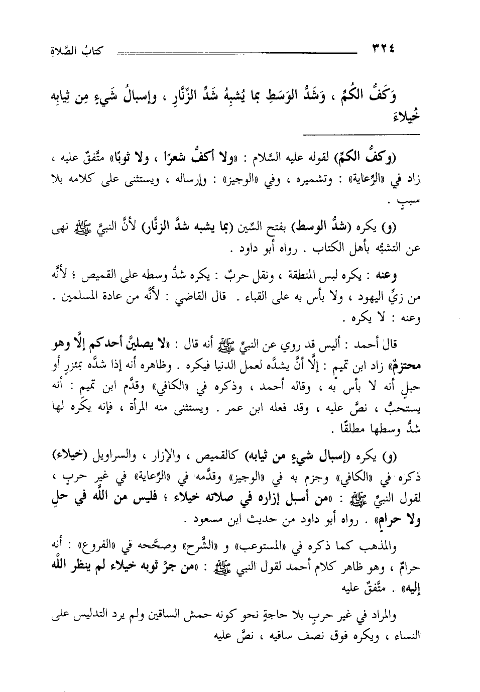 قال أحمد أليس قد روي عن النبي صلى الله عليه وسلم أنه قال: "لا يصلين أحدكم إلا وهو محتزم" زاد ابن تميم إلا أن يشده لعمل الدنيا فيكره وظاهره أنه إذا شده بمئزر أو حبل أنه لا بأس به وقاله أحمد وذكره في الكافي وقدم ابن تميم أنه يستحب نص عليه وقد فعله ابن عمر ويستثنى منه المرأة فإنه يكره لها شد وسطها مطلقا