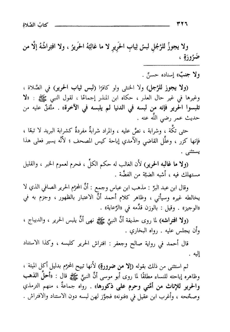 ثم استثنى من ذلك بقوله "إلا من ضرورة" لأنها تبيح المحرم بدليل أكل الميتة وظاهره إباحته للنساء مطلقا لما روى أبو موسى أن النبي صلى الله عليه وسلم قال "أحل الذهب والحرير للإناث من أمتي وحرم على ذكورها " رواه جماعة منهم الترمذي وصححه وأغرب ابن عقيل في فنونه فجوز لهن لبسه دون الاستناد والافتراش .