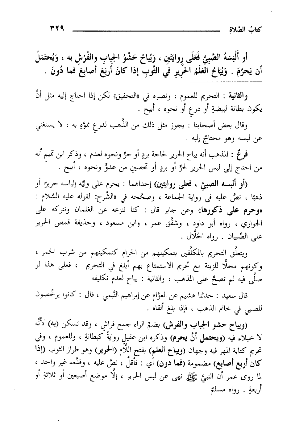 أو ألبسه الصبي فعلى روايتين ويباح حشو الجباب والفرش به ويحتمل أن يحرم ويباح العلم الحرير في الثوب إذا كان أربع أصابع فما دون