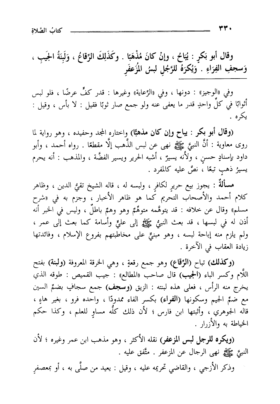 وقال أبو بكر يباح وإن كان مذهبا وكذلك الرقاع ولبنة الجيب وسجف الفراء ويكره للرجل لبس المزعفر