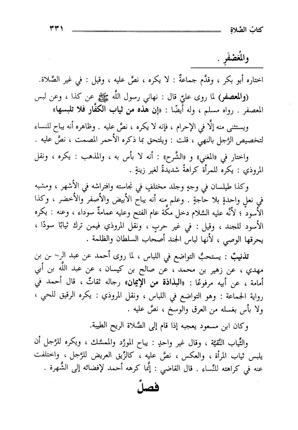 ويستثنى منه إلا في الإحرام فإنه لا يكره نص عليه وظاهره أنه يباح للنساء لتخصيص الرجل بالنهي قلت ويلتحق بما ذكره الأحمر المصمت نص عليه واختار في المغني و الشرح أنه لا بأس به والمذهب يكره ونقل المروذي يكره للمرأة كراهة شديدة لغير زينة.