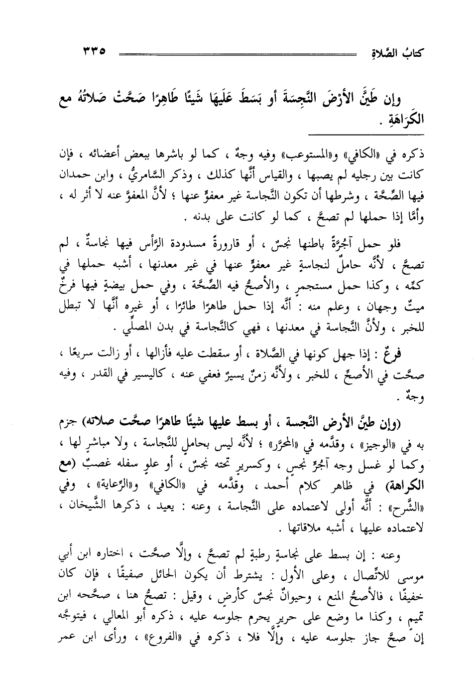 "وإن طين الأرض النجسة أو بسط عليها شيئا طاهرا صحت صلاته" جزم به في الوجيز وقدمه في المحرر لأنه ليس بحامل للنجاسة ولا مباشر لها وكما لو غسل وجه آجر نجس وكسرير تحته نجس أو علو سفله غصب "مع الكراهة" في ظاهر كلام أحمد وقدمه في الكافي و الرعاية وفي الشرح أنه أولى لاعتماده على النجاسة وعنه يعيد ذكرها الشيخان لاعتماده عليها أشبه ملاقاتها