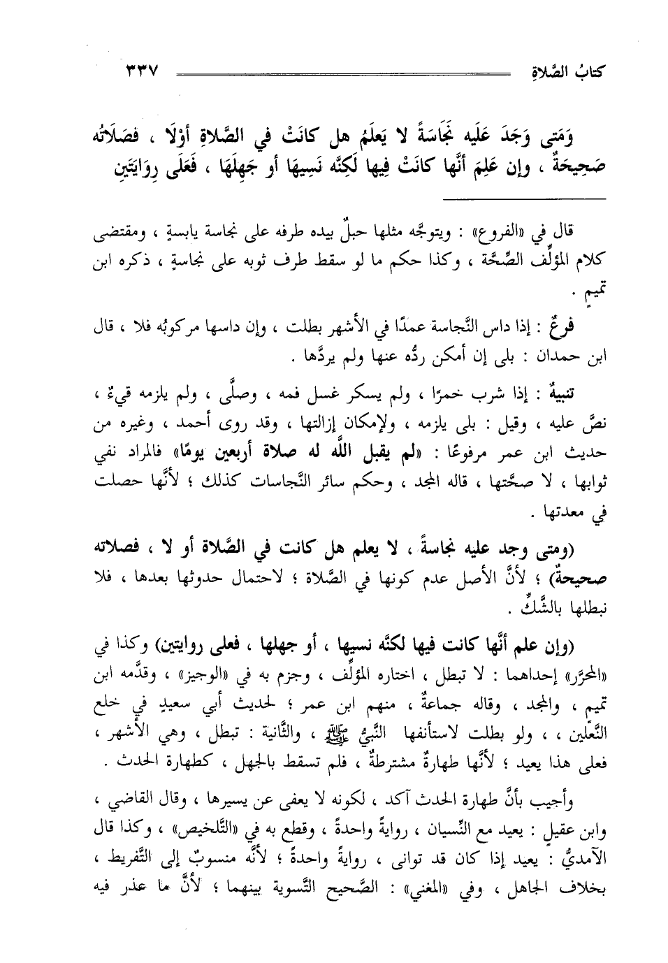 "وإن علم أنها كانت فيها لكنه نسيها أو جهلها فعلى روايتين" وكذا في المحرر إحداهما لا تبطل اختاره المؤلف وجزم به في الوجيز وقدمه ابن تميم والمجد وقاله جماعة منهم ابن عمر لحديث أبي سعيد في خلع النعلين ولو بطلت لاستأنفها النبي صلى الله عليه وسلم والثانية:تبطل وهي الأشهر فعلى هذا يعيد لأنها طهارة مشترطة فلم تسقط بالجهل كطهارة الحدث