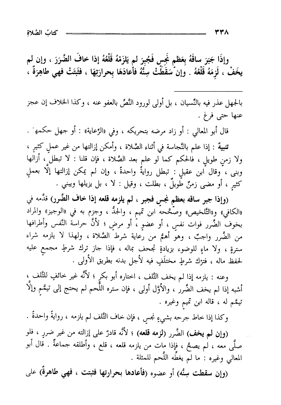 "وإذا جبر ساقه بعظم نجس فجبر لم يلزمه قلعه إذا خاف الضرر" قدمه في الكافي و التلخيص وصححه ابن تميم والجد وجزم به في الوجيز والمراد بخوف الضرر فوات نفس أو عضو أو مرض لأن حراسة النفس وأطرافها من الضرر واجب وهو أهم من رعاية شرط الصلاة ولهذا لا يلزمه شراء سترة ولا ماء للوضوء بزيادة تجحف بماله فإذا جاز ترك شرط مجمع عليه لحفظ ماله فترك شرط مختلف فيه لأجل بدنه بطريق الأولى.