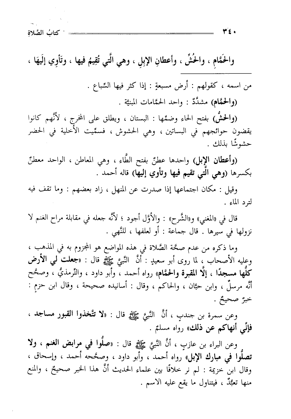 وما ذكره من عدم صحة الصلاة في هذه المواضع هو المجزوم به في المذهب وعليه الأصحاب لما روى أبو سعيد أن النبي صلى الله عليه وسلم قال: "جعلت لي الأرض كلها مسجدا إلا المقبرة والحمام" رواه أحمد وأبو داود والترمذي وصحح أنه مرسل وابن حبان والحاكم وقال أسانيده صحيحة وقال ابن حزم خبر صحيح.
