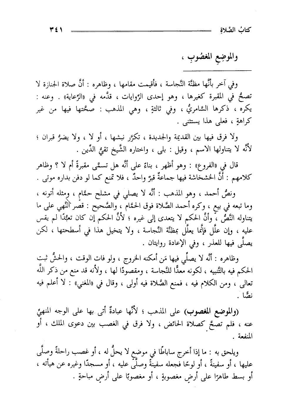 وفي آخر بأنها مظنة النجاسة فأقيمت مقامها وظاهره أن صلاة الجنازة لا تصح في المقبرة كغيرها وهو إحدى الروايات قدمه في الرعاية وعنه يكره ذكرها السامري وفي ثالثة وهي المذهب صحتها فيها من غيركراهة فعلى هذا يستثنى.