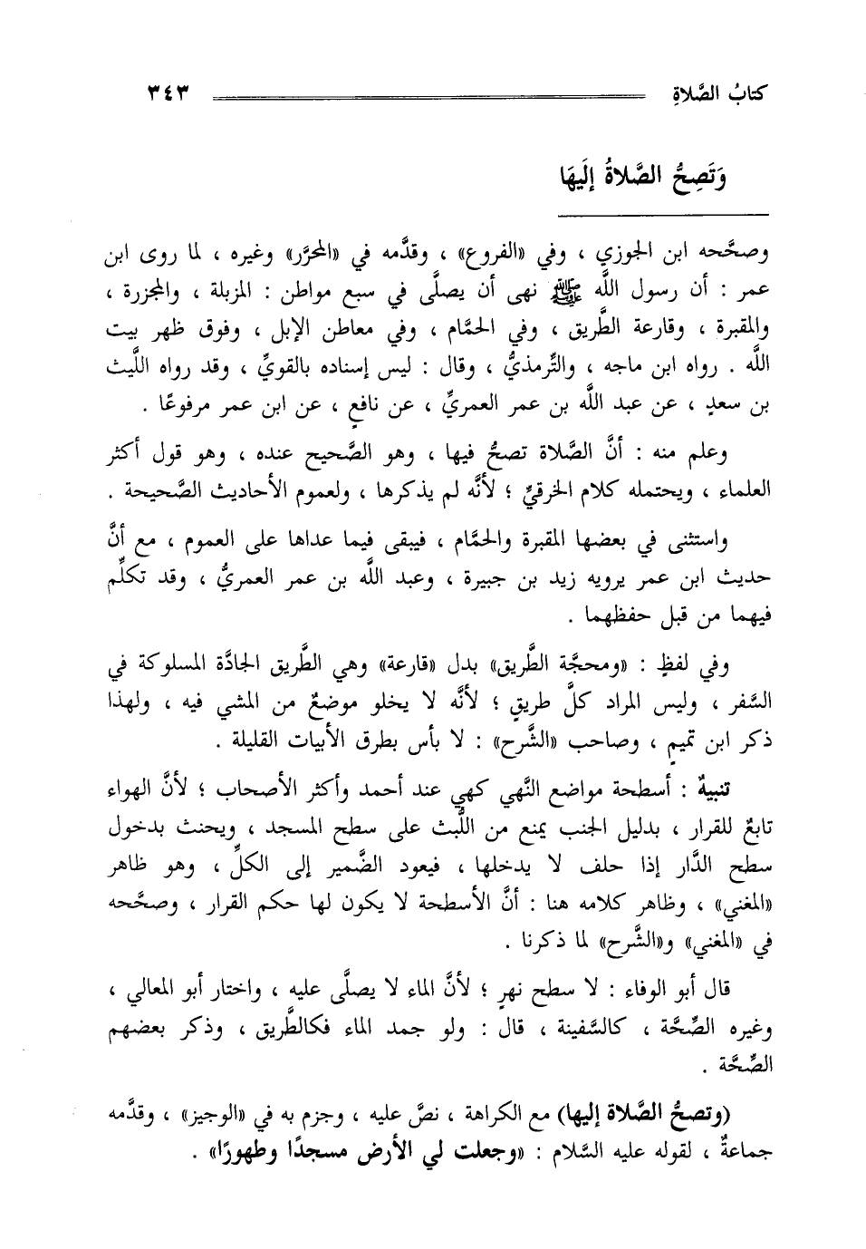 وصححه ابن الجوزي وفي الفروع وقدمه في المحرر وغيره لما روى ابن عمر "أن رسول الله صلى الله عليه وسلم نهى أن يصلى في سبع مواطن المزبلة والمجزرة والمقبرة وقارعة الطريق وفي الحمام وفي معاطن الإبل وفوق ظهر بيت الله" رواه ابن ماجة والترمذي وقال ليس إسناده بالقوي وقد رواه الليث بن سعد عن عبد الله بن عمر العمري عن نافع عن ابن عمر مرفوعا.